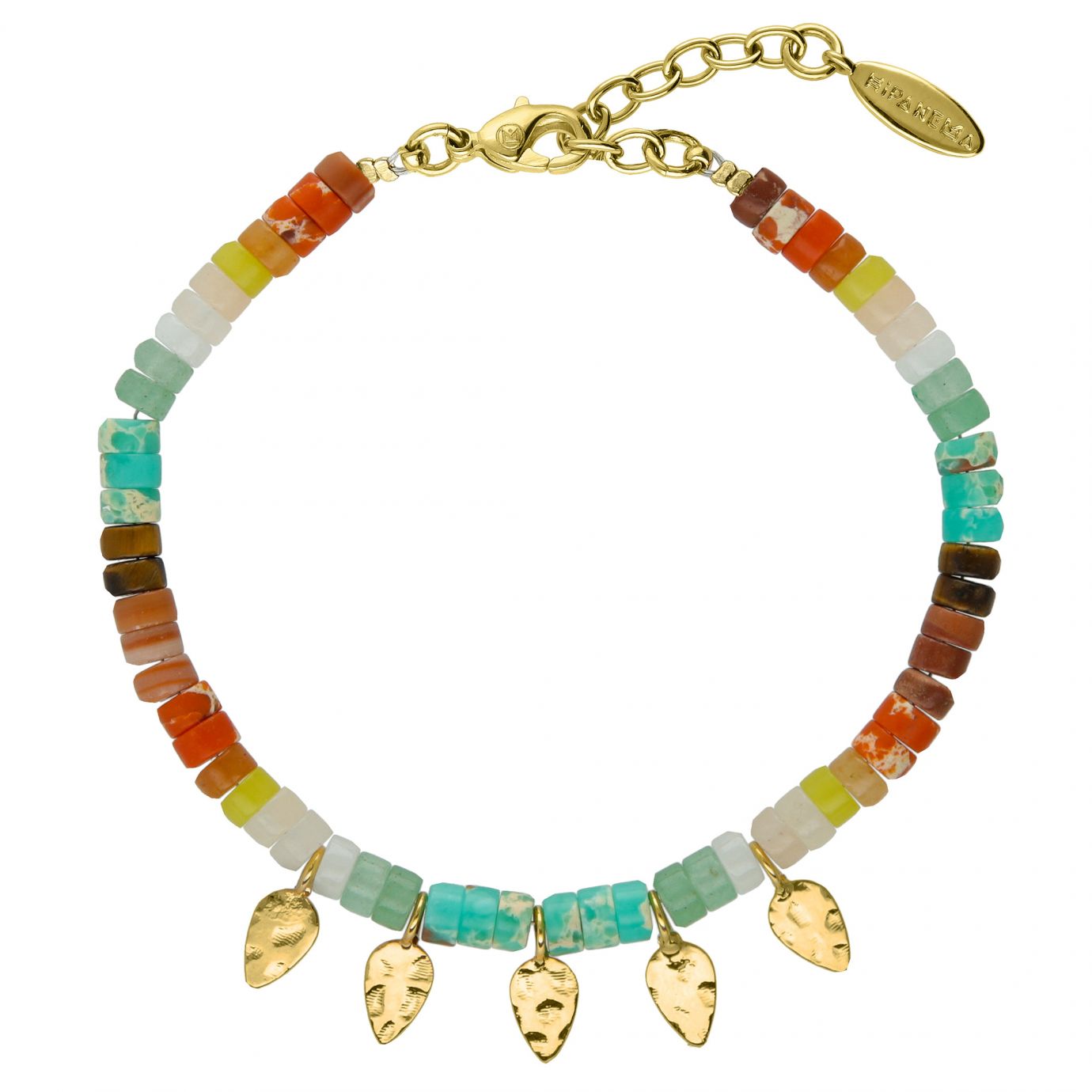 Bracelet made up of semi-precious beads in shades of color in shades of jade green, turquoise, beige, yellow, orange and brown. You will love the small ornate palm tassels in the center of the necklace which bring a gypsy touch to this piece which evokes the Navajo tribes.