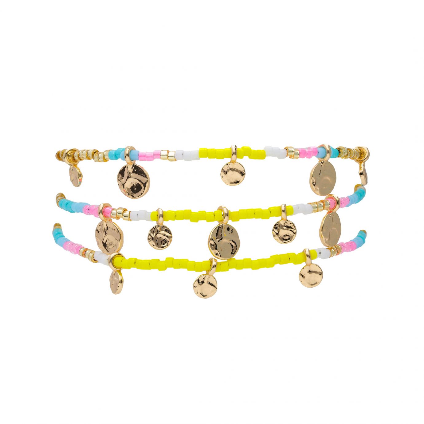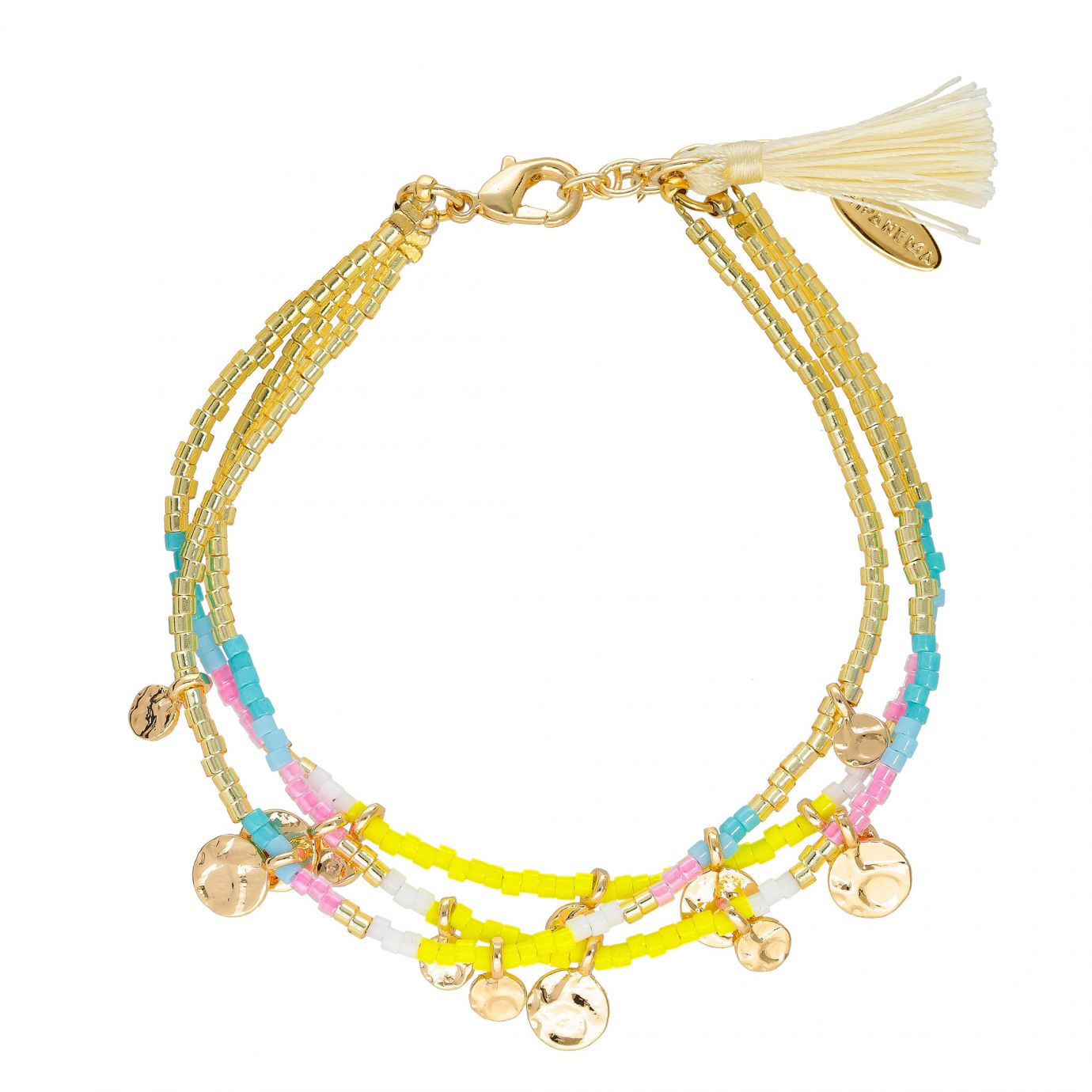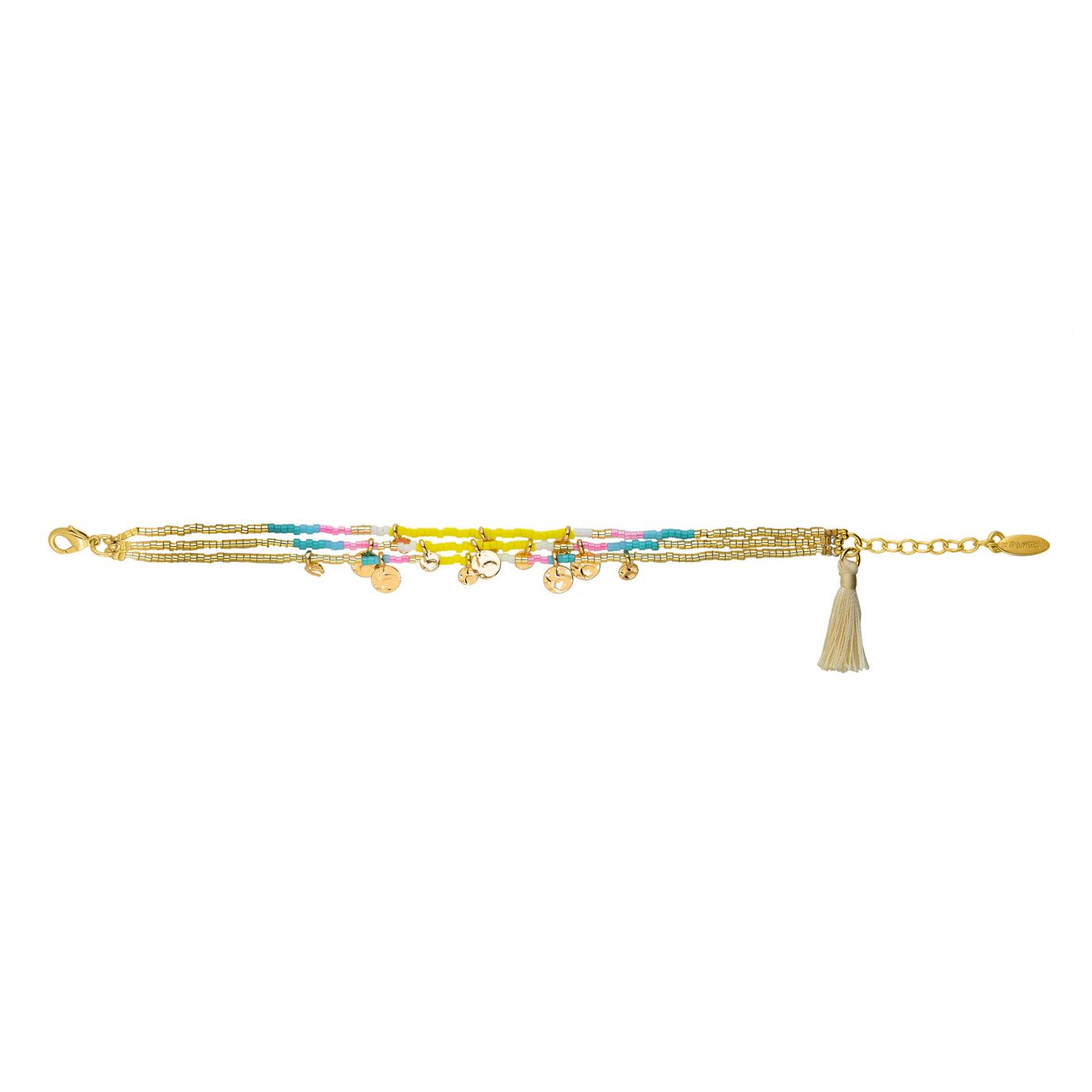 Small multi-link bracelet made up of three links in seed beads in shades of gold, fluorescent pink, yellow and turquoise with a resolutely Native American look. It is adorned with small ornate pendants gilded with fine 14 carat gold.