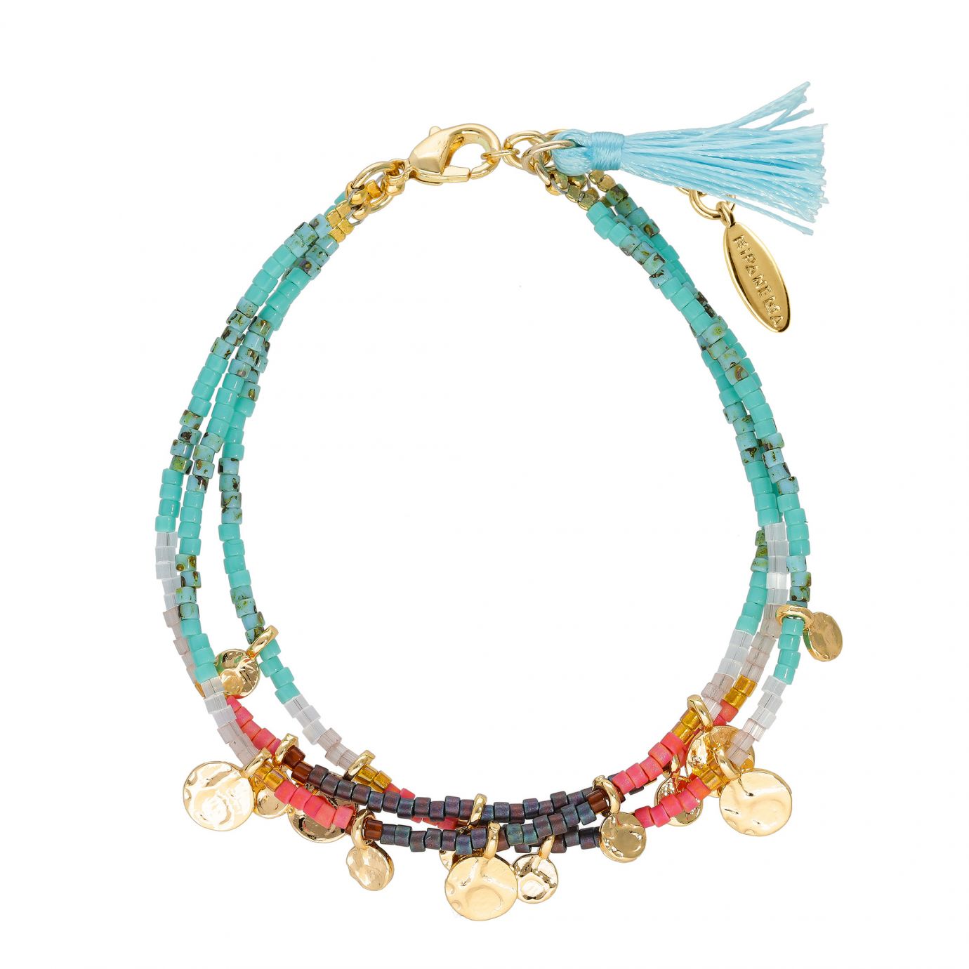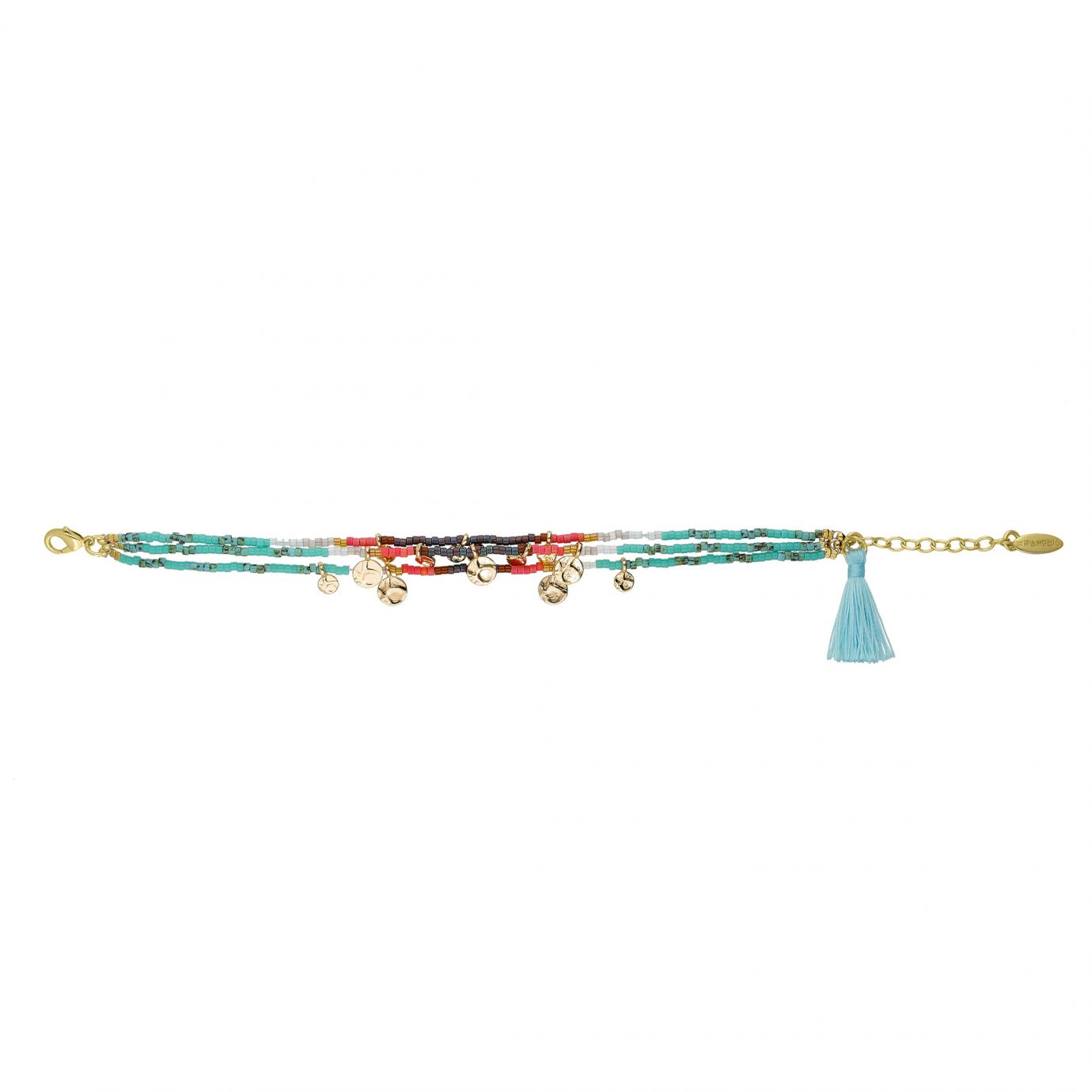 Small multilink bracelet gilded with fine 14 carat gold, composed of three links in seed beads in shades of turquoise, brown, red and beige with a resolutely Amerindian look. It is adorned with small ornate pendants gilded with fine 14 carat gold.