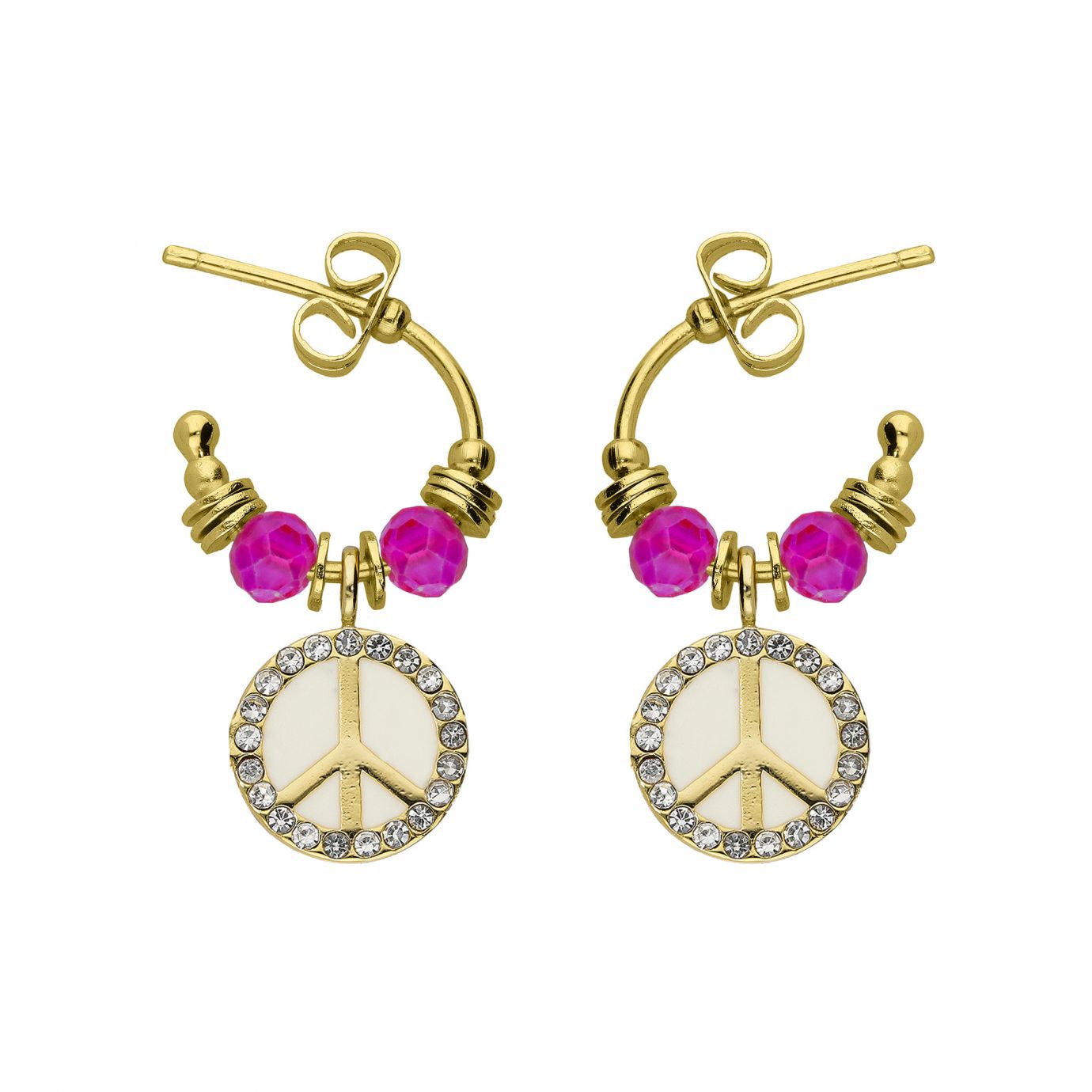 Small hoop-shaped earrings, gilded with fine 14 carat gold. They are decorated with a small central tassel in white enamel bearing the peace and love symbol surrounded by diamond-effect rhinestones. They are enhanced with two faceted fluorescent pink beads.