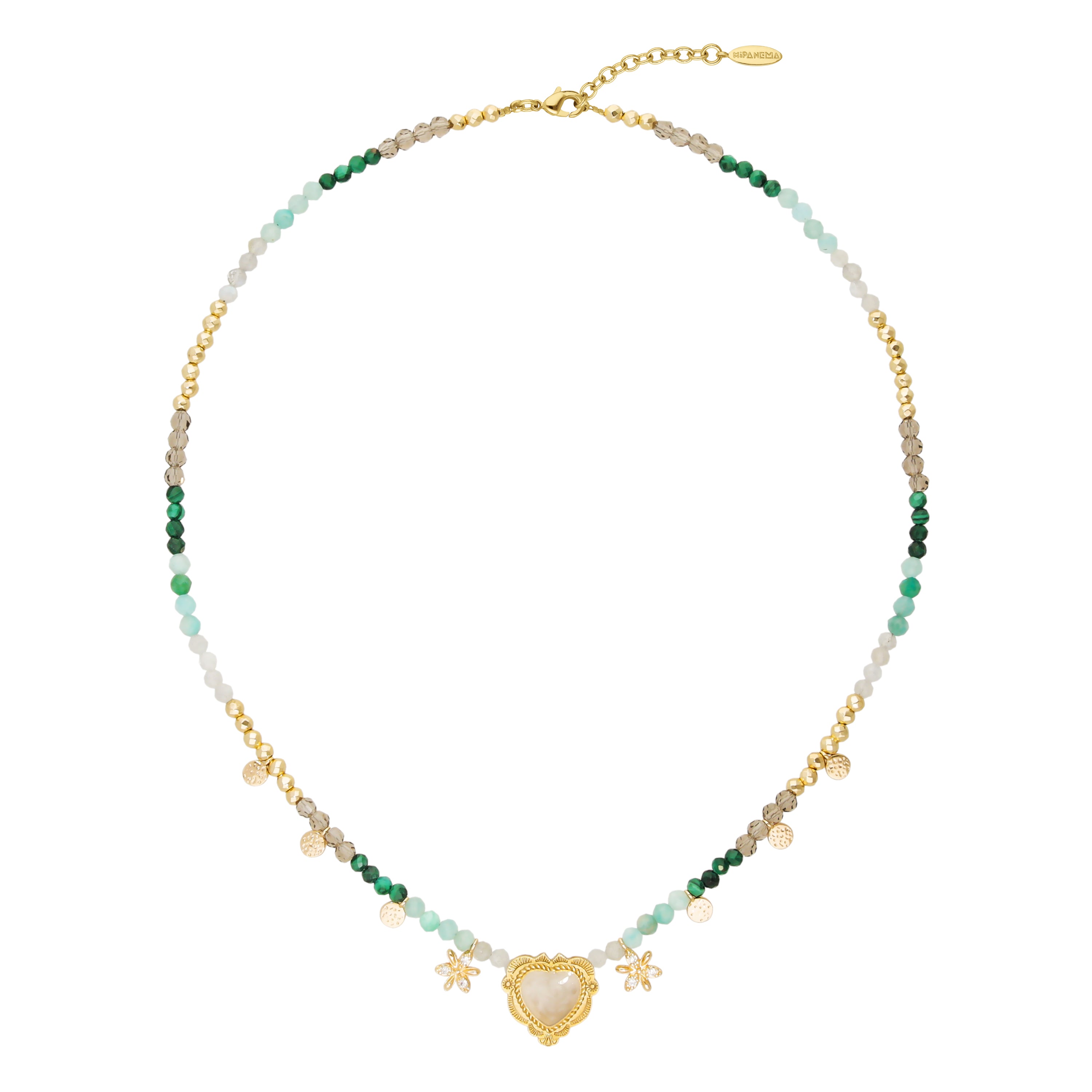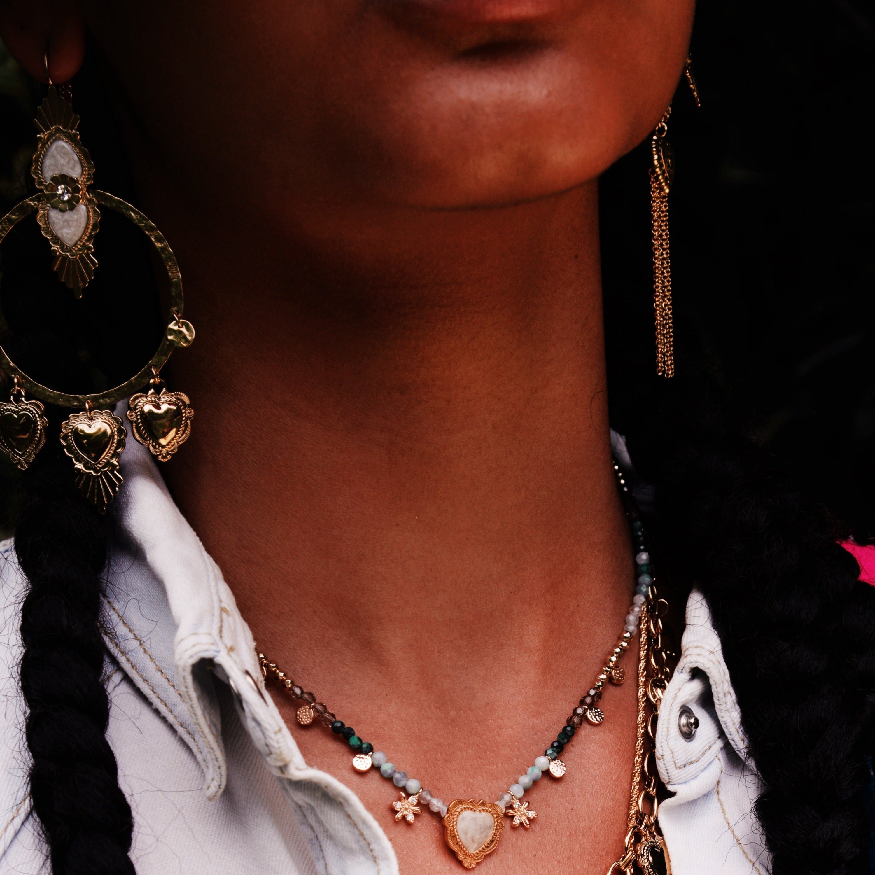 Necklace gilded with fine gold in semi-precious stones - turquoise, hematite, amazonite, labradorite -, enhanced with small brass pendants gilded with fine gold. We love the Latin American mix of colored stones, with this central cabochon in the shape of an ex-voto heart, inspired by New Mexico, adorned with a pearly white resin. It is surrounded by two small diamond-effect rhinestone daisies. A lovely easy piece, right in the Hipanema DNA, to wear alone or in accumulation. This jewelry is handmade.
