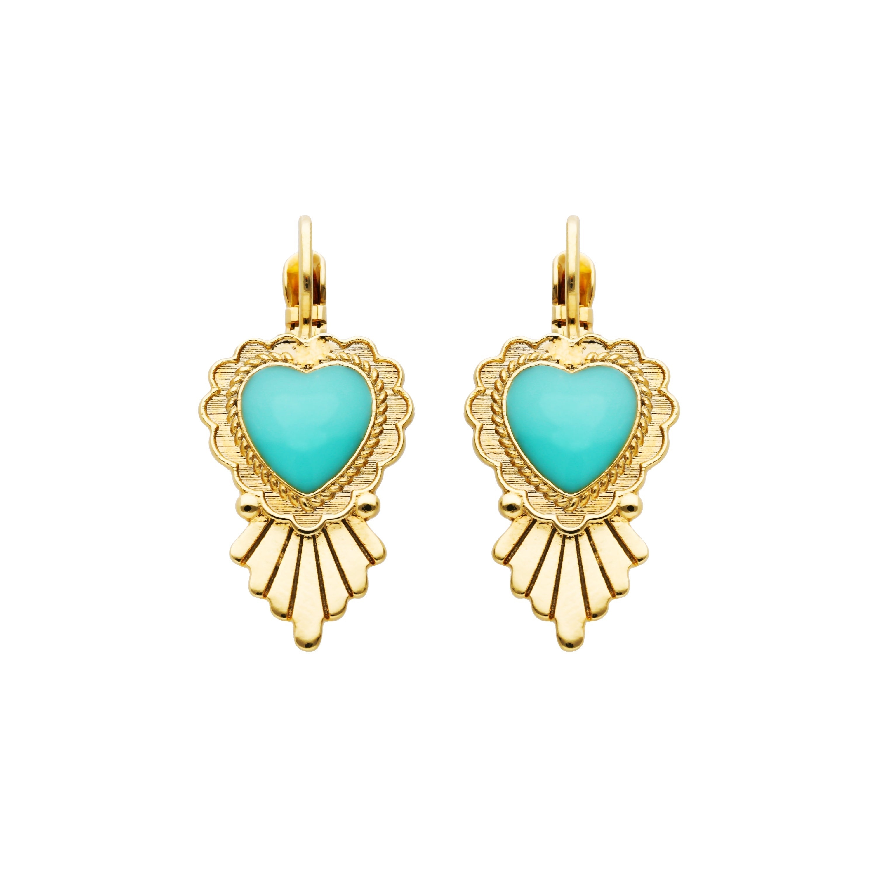 Brass earrings gilded with fine gold for pierced ears with a sleeper attachment. A heart in turquoise resin is at the center of this elegant model worked with gadroons, in an ex-voto spirit perfect for declaring your love. We love this Navajo, New Mexico inspiration to wear in a baroque and colorful total look or to twist a wiser look. This jewelry is handmade.