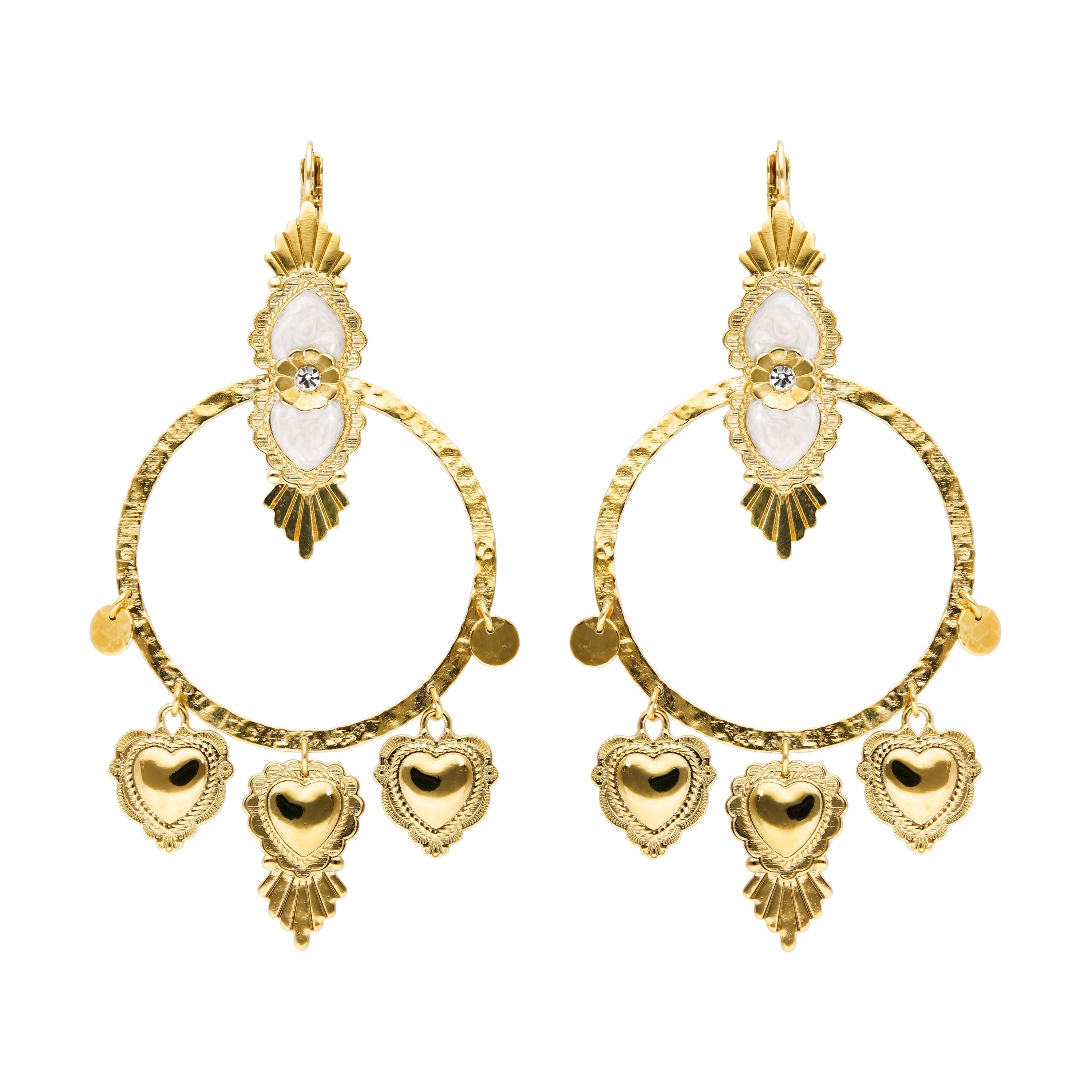 Creole earrings for pierced ears gilded with fine gold, fitted with a sleeper attachment. The head of the earring is composed of two inverted hearts in pearly resin, hammered, worked in a baroque style on a Creole ring decorated with golden charm pendants: small hearts and sequins of Latin American inspiration. We love this association of colors between mother-of-pearl and gold effect in a New Mexico spirit. This jewelry is handmade.