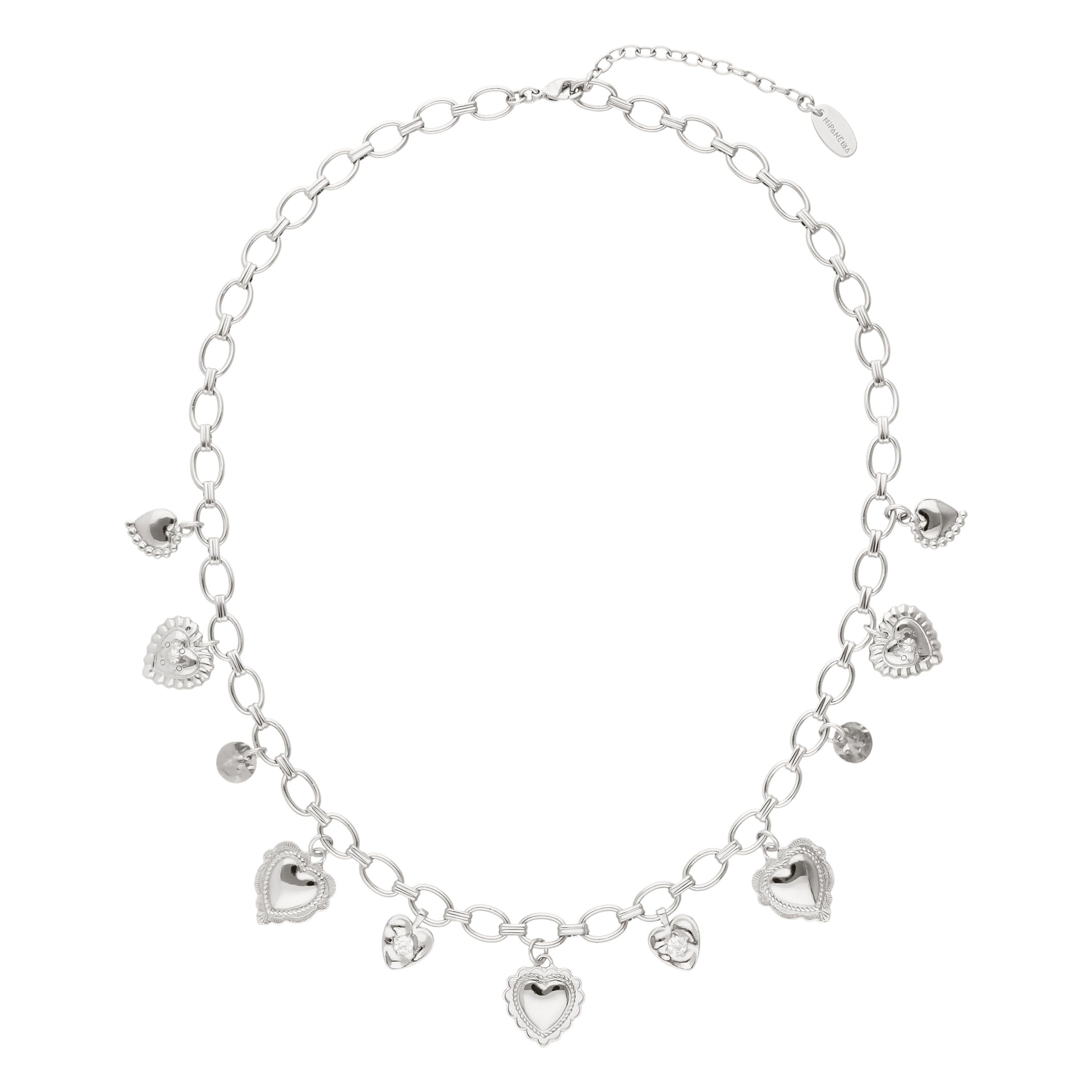 Silver choker necklace on a chain with a round and opulent jaseron link, with charm effect tassels. We love this Navajo, New Mexico spirit, common theme of our collection. In its center, three silver hearts worked ex-voto, are surrounded by small heart charms, adorned with diamond-effect rhinestones. This jewelry is handmade.