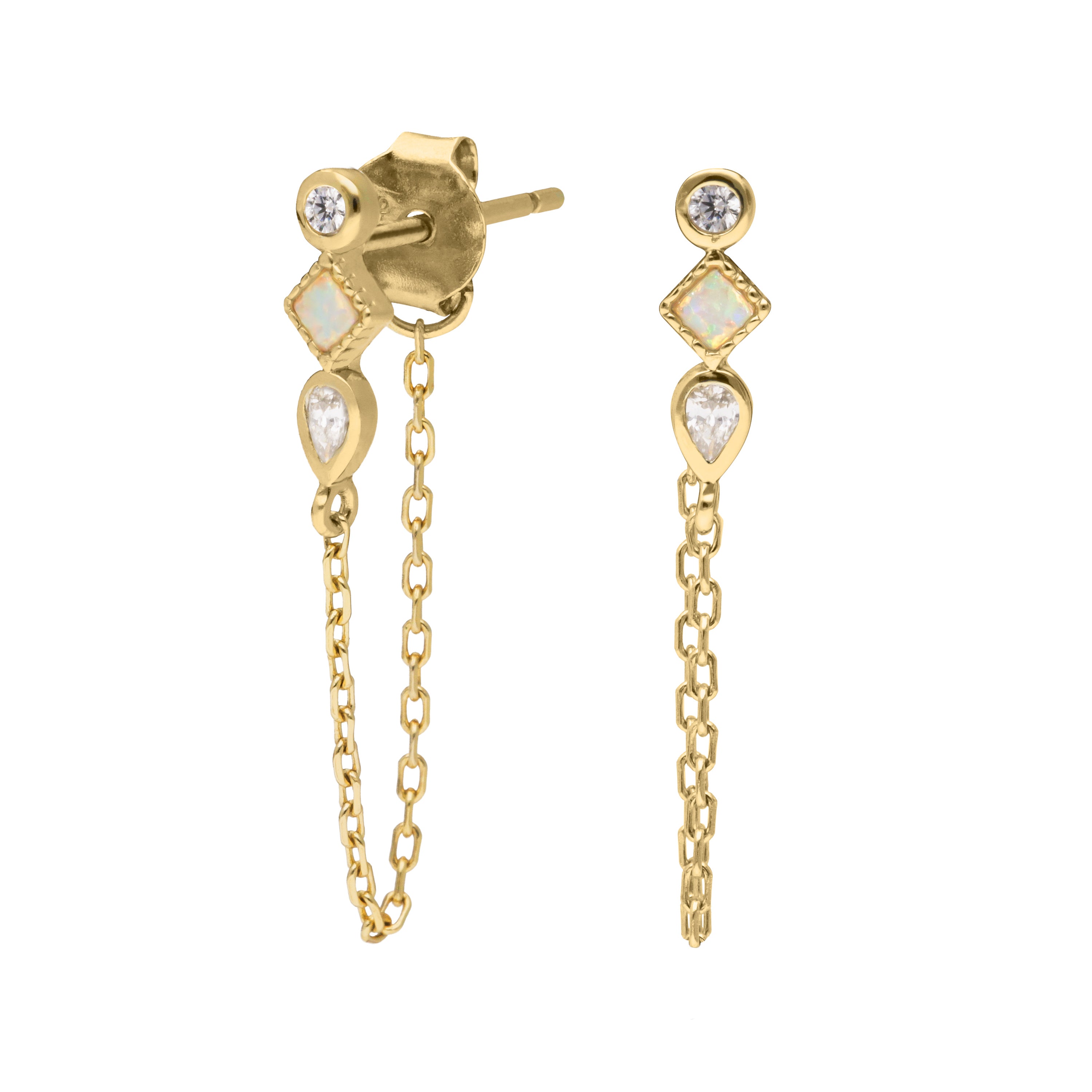 Earrings for pierced ears with totem earring head, composed of a round diamond-effect rhinestone pendant, an opal rhombus and a diamond-effect marquise stone. There is a small cable chain that connects the buckle to the clasp positioned at the back of the lobe for a rock and elegant effect at the same time. These very pretty timeless earrings are an opportunity to discover the magical virtues of opal, a stone with multicolored rainbow reflections. Gilded with fine 18-carat gold on genuine 925 silver, this vermeil jewel is guaranteed to be allergy-free.