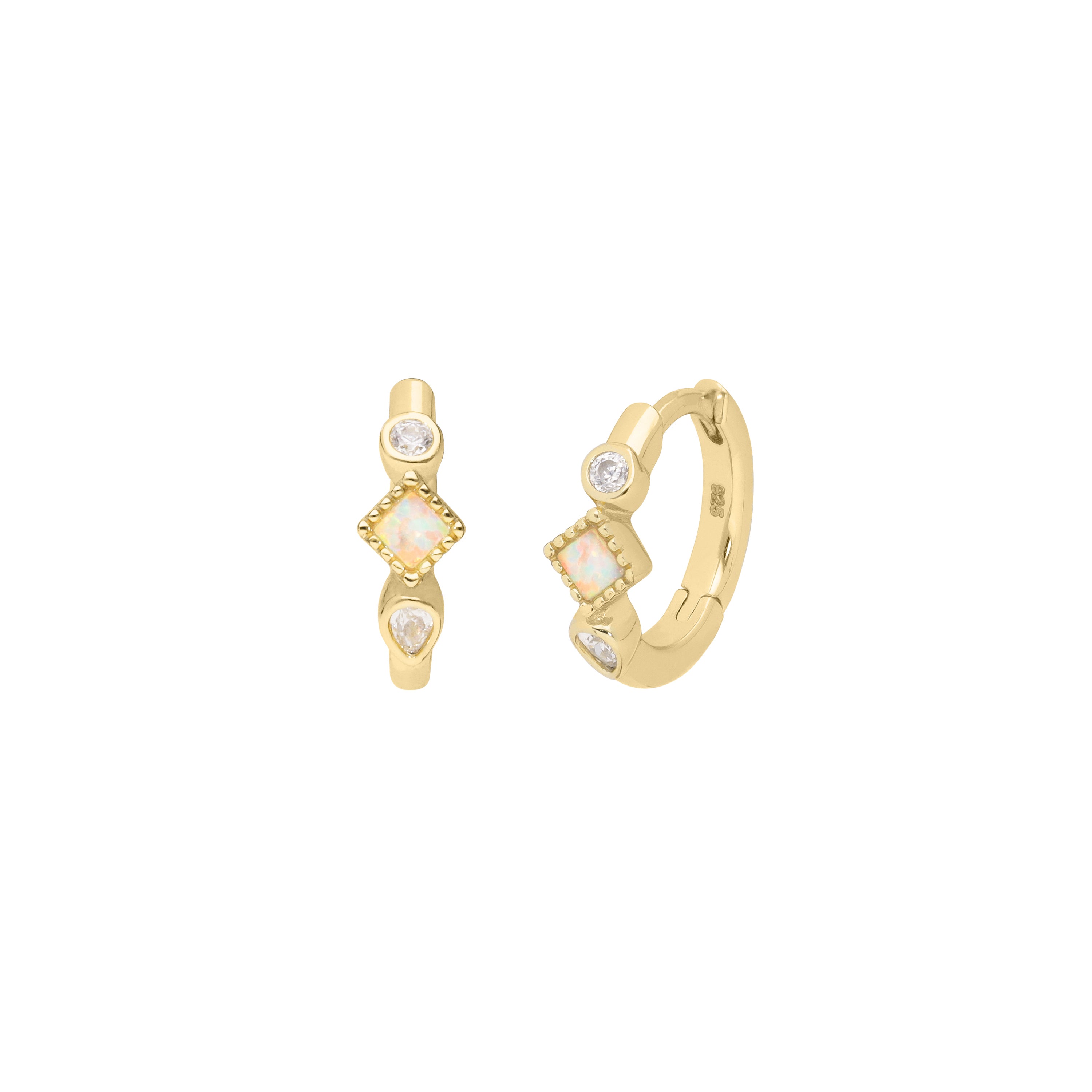 Mini-hoops with rhinestone totem composed of a round diamond-effect rhinestone tassel, an opal rhombus and a diamond-effect marquise stone. These very pretty timeless earrings are an opportunity to discover the magical virtues of opal, a stone with multicolored rainbow reflections. Gilded with fine 18-carat gold on genuine 925 silver, this vermeil jewel is guaranteed to be allergy-free.