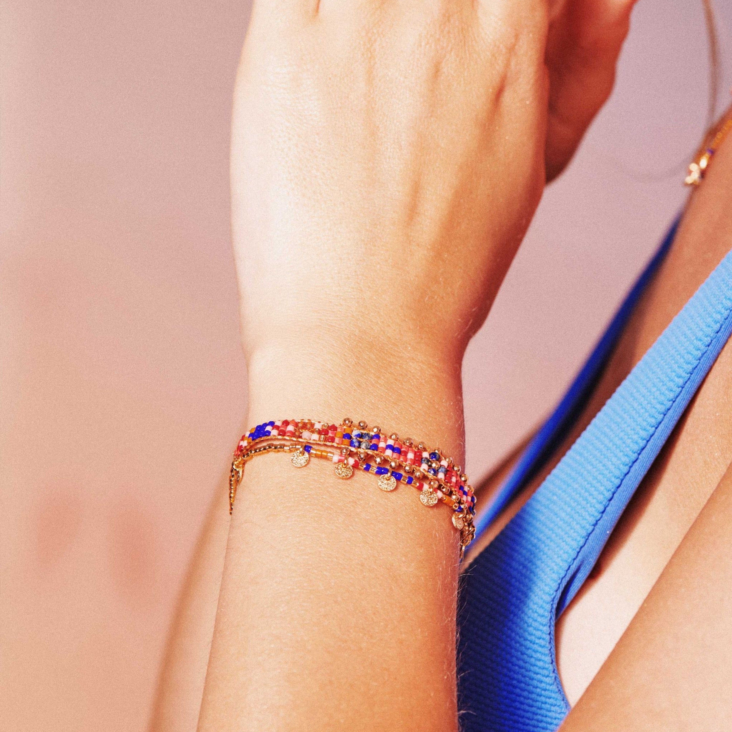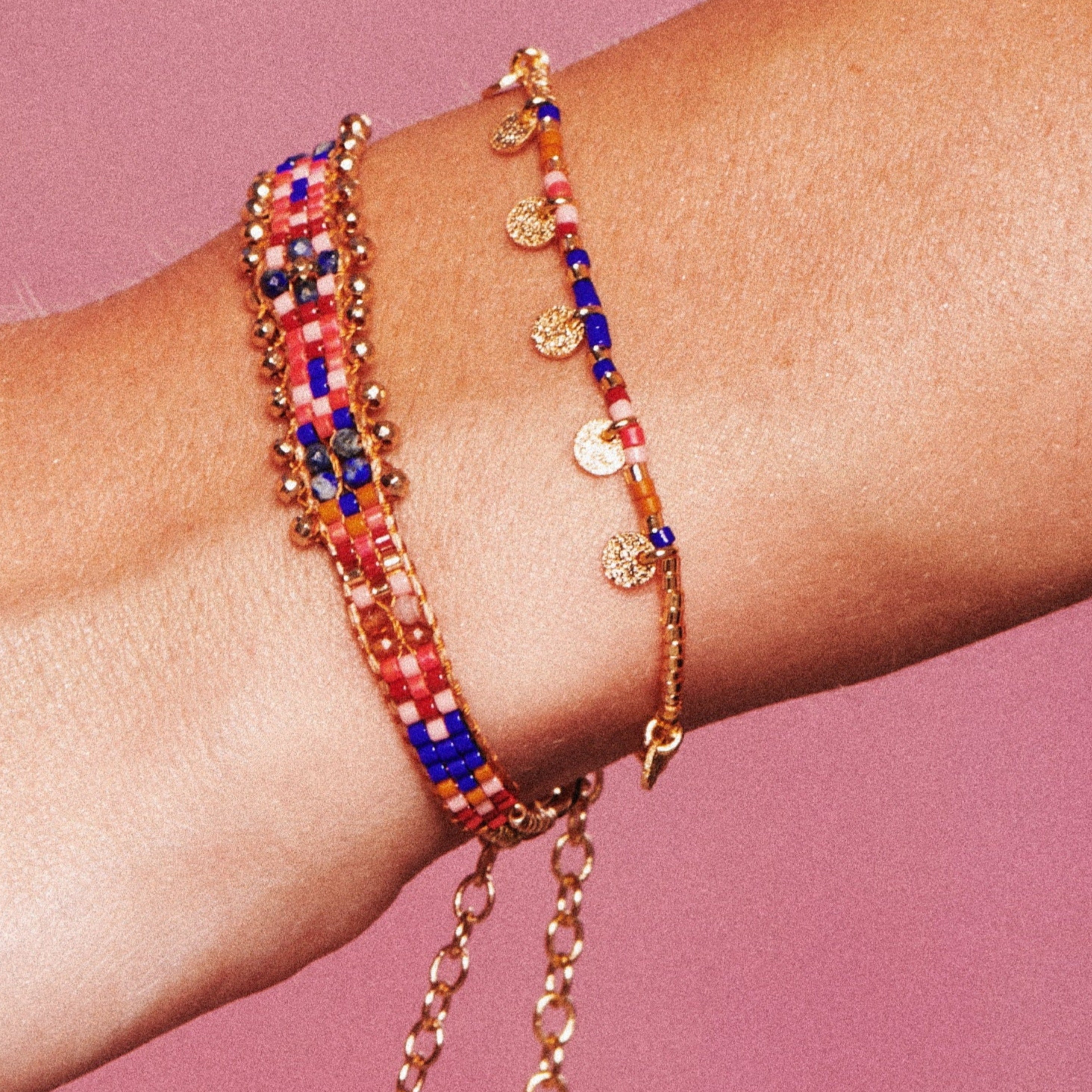 Woven bracelet, with a precious lobster clasp, gilded with fine 18 carat gold. In its center, there is a woven motif of ethnic inspiration where Miyuki pearls mingle, in variations of off-white, peach, pink and cream, with semi-precious faceted pearls in hematite and white jade, as well as microscopic pearls at the end of the bracelet. Hipanema innovates here with a very elegant and original weave for this handmade bracelet.e: 15cm + 3cm
