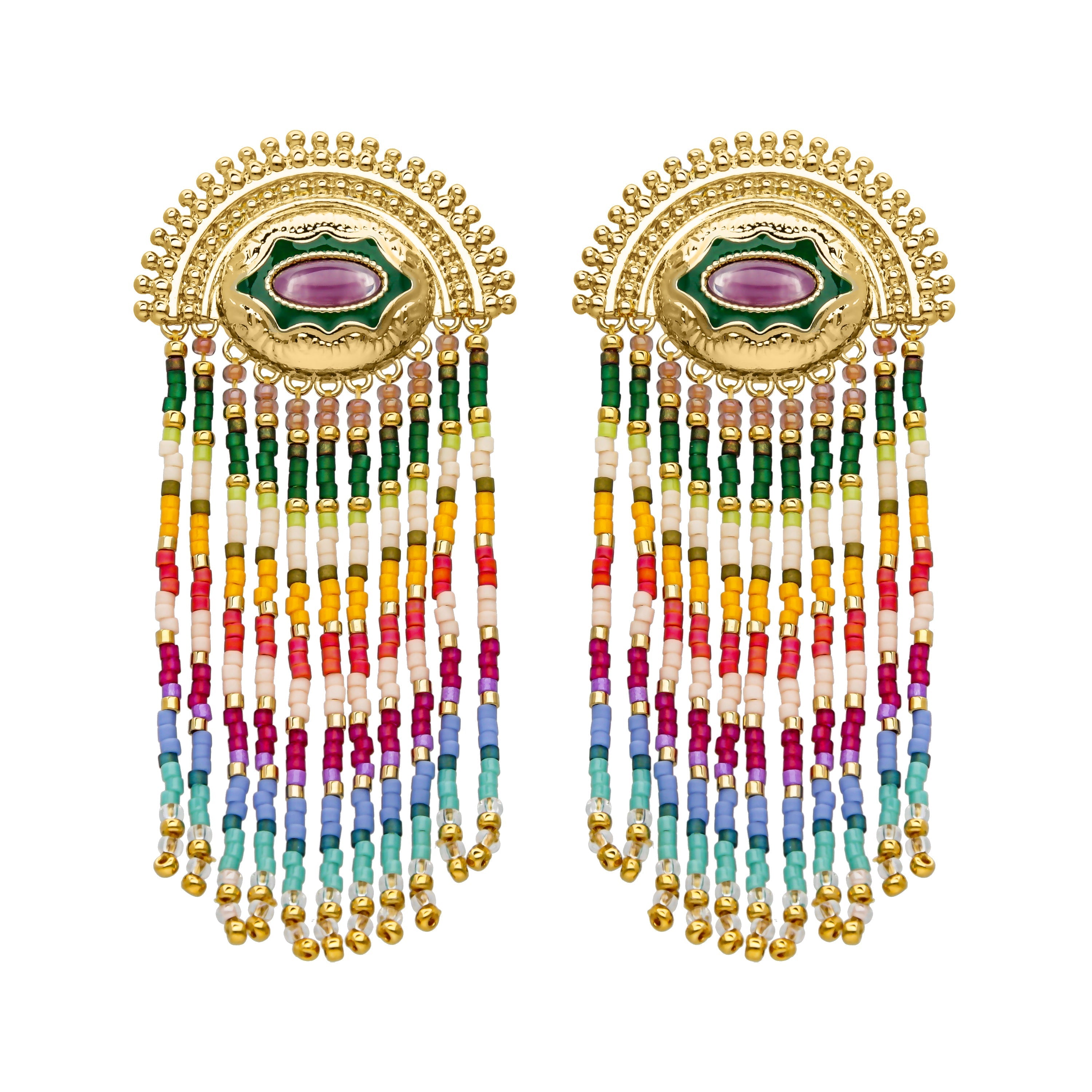 To you the Mayan deities! Earrings gilded with fine gold, suitable for non-pierced ears with their clip clasp. We find an exceptional buckle head that takes up the Mayan codes, with an ornate crown. The cabochon is worked with enamel on a pearlescent stone, and overlooks a fringed cascade of eleven beaded links, in colors of white, peach, gold and off-white. A pair of XXL earrings to make you a queen on all occasions! This jewelry is handmade.