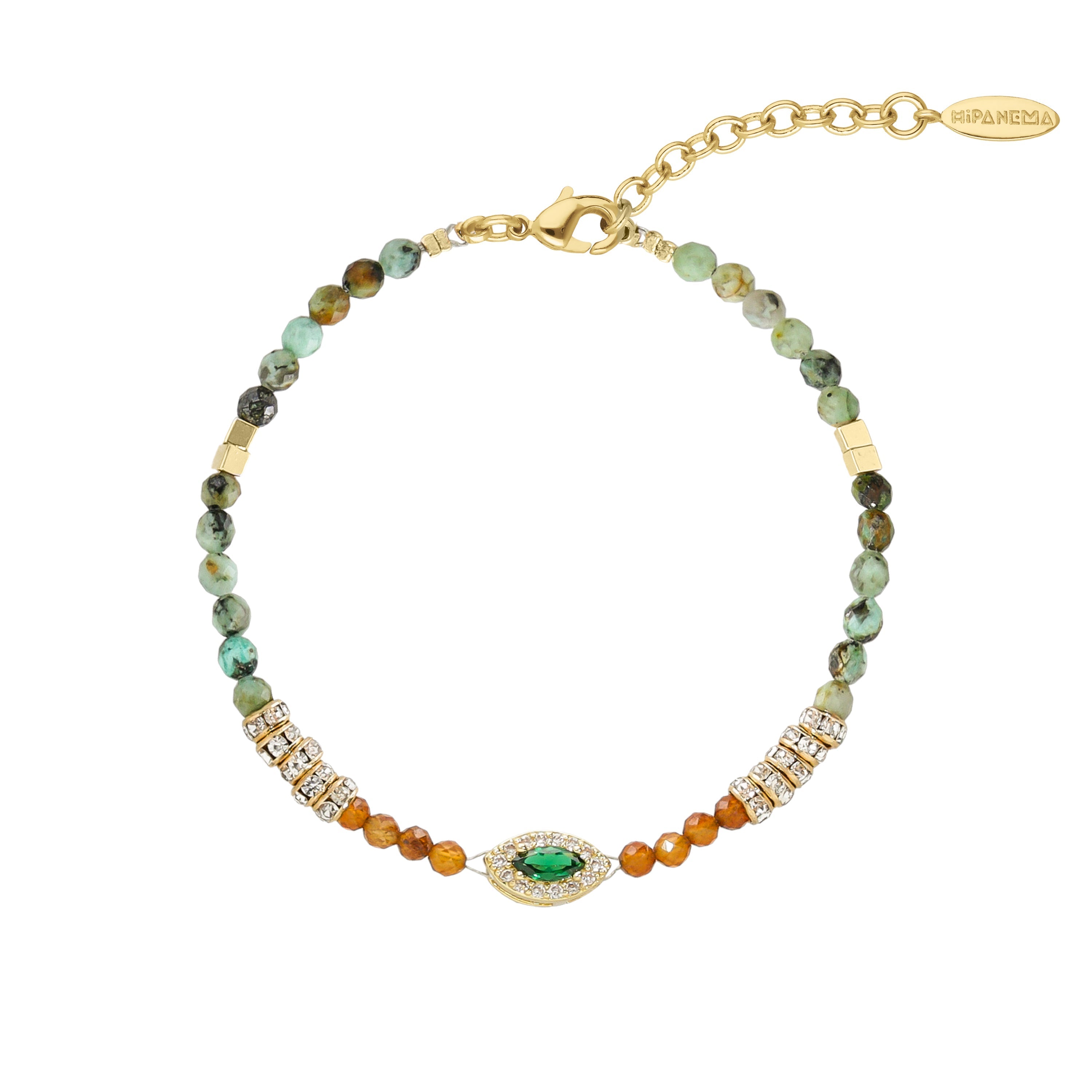 This winter, you too will fall for this precious and colorful piece with a resolutely bohemian spirit! This small bracelet gilded with fine 14 carat gold is entirely made of semi-precious stones in onyx black, emerald green and amber tones. It is decorated with small multicolored tassels with a medal representing an eye in its center, entirely paved with diamond-effect rhinestones and a central emerald green rhinestone. It is also adorned with two small burgundy red and yellow pompoms, two small bells as well as two orange and sapphire blue rhinestone drops.