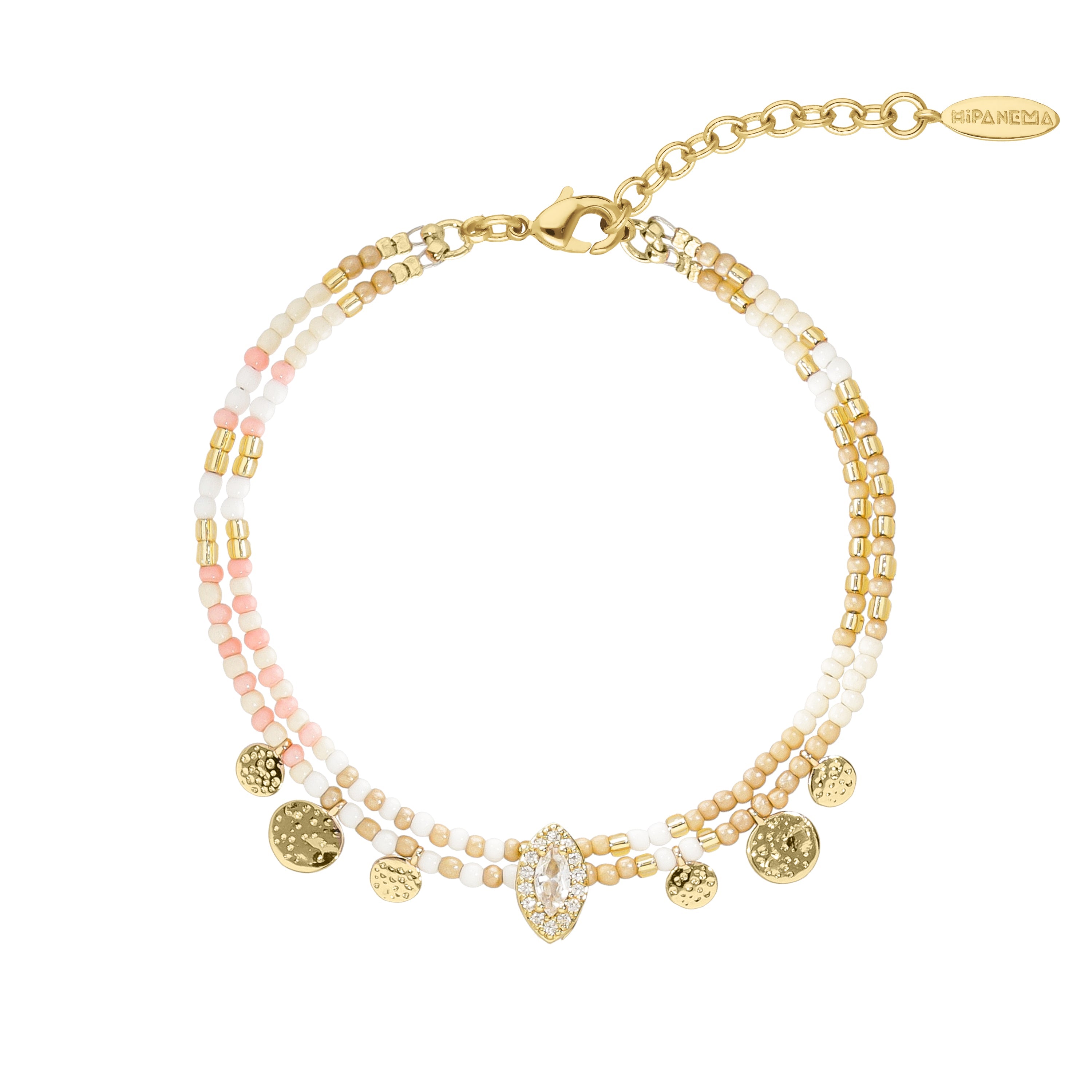Small bracelet gilded with fine 14 carat gold entirely made of wires wound in shades of turquoise blue, black, silver and gold. It is decorated with small colored pompoms and bells, as well as a daisy in its center which is decorated with a sapphire blue rhinestone. You will love its Brazilian look revisited in the style of Hipanema!