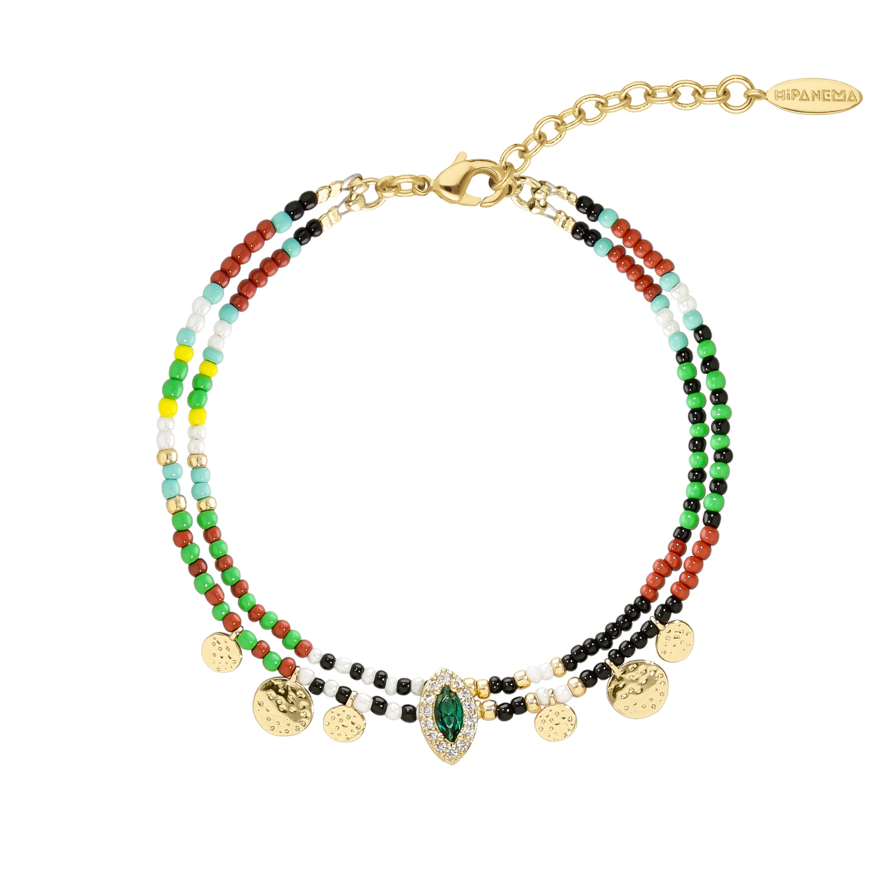 Small bracelet gilded with fine 14 carat gold entirely made of wires wound in shades of turquoise blue, black, silver and gold. It is decorated with small colored pompoms and bells, as well as a daisy in its center which is decorated with a sapphire blue rhinestone. You will love its Brazilian look revisited in the style of Hipanema!