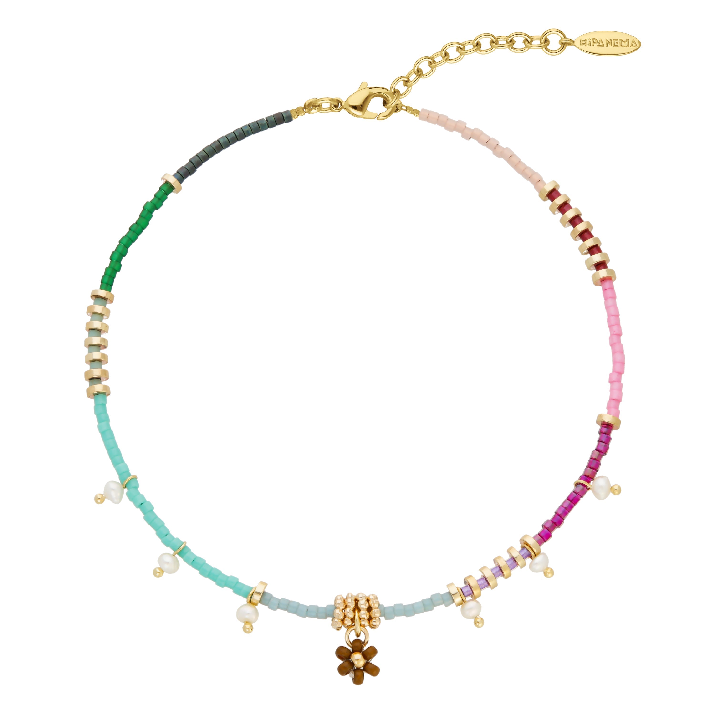 Necklace gilded with fine gold in semi-precious stones - turquoise, hematite, amazonite, labradorite -, enhanced with small brass pendants gilded with fine gold. We love the Latin American mix of colored stones, with this central cabochon in the shape of an ex-voto heart, inspired by New Mexico, adorned with a pearly white resin. It is surrounded by two small diamond-effect rhinestone daisies. A lovely easy piece, right in the Hipanema DNA, to wear alone or in accumulation. This jewelry is handmade.