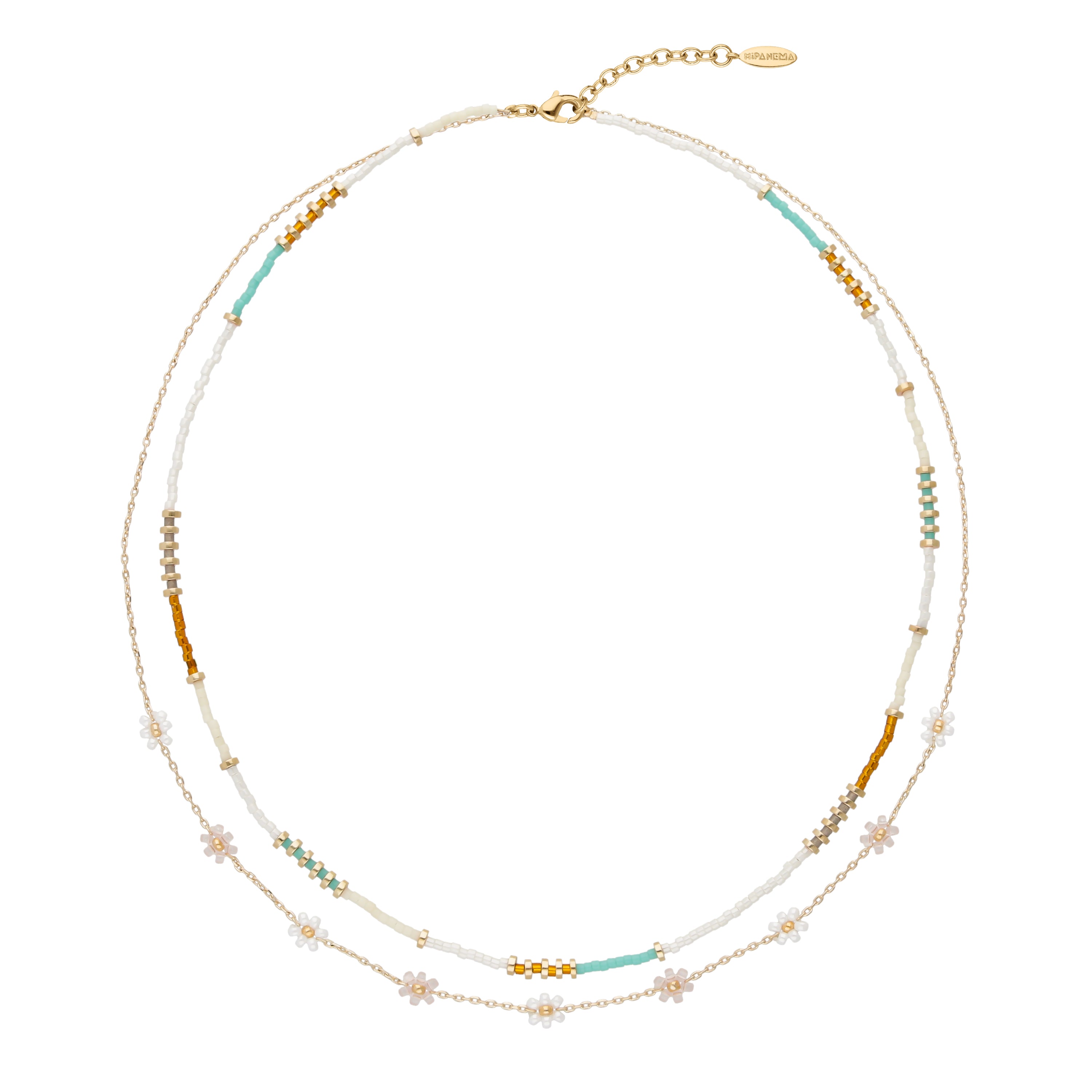 Necklace gilded with fine gold in semi-precious stones - turquoise, hematite, amazonite, labradorite -, enhanced with small brass pendants gilded with fine gold. We love the Latin American mix of colored stones, with this central cabochon in the shape of an ex-voto heart, inspired by New Mexico, adorned with a pearly white resin. It is surrounded by two small diamond-effect rhinestone daisies. A lovely easy piece, right in the Hipanema DNA, to wear alone or in accumulation. This jewelry is handmade.