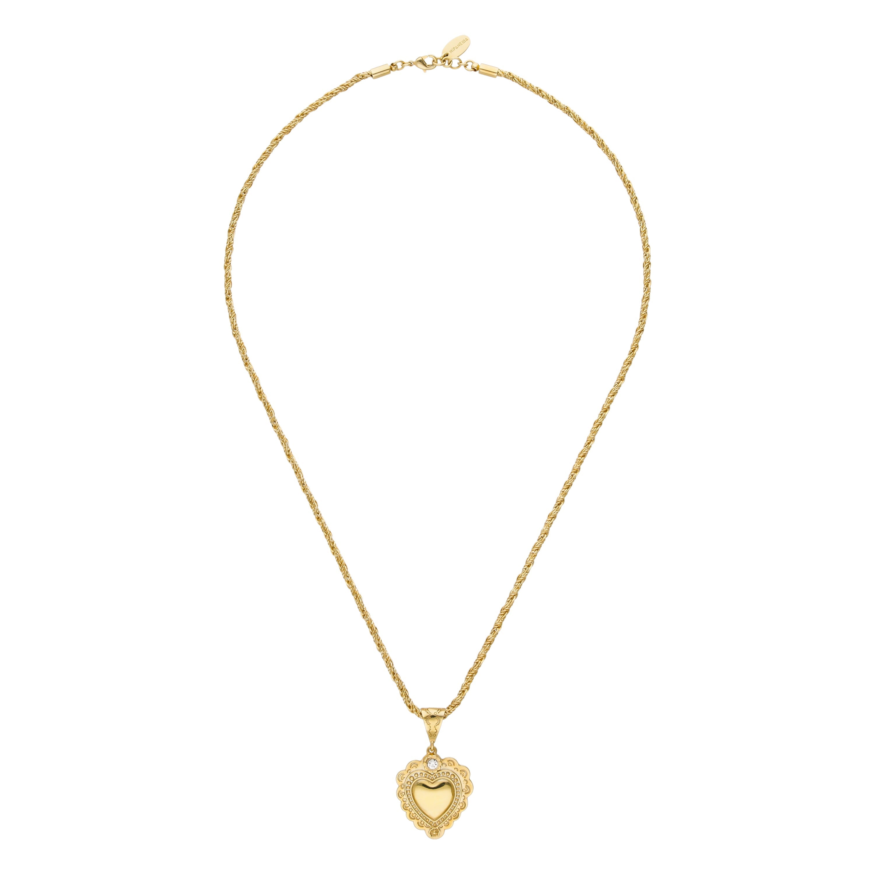 Necklace resembling a long necklace gilded with fine gold, with a chain worked in a very precious way, which evokes traditions and transmissions. Around this chain, a medallion in the shape of an ex-voto heart, topped with a small diamond-effect rhinestone, held by a bail very worked with delicate Navajo symbols. We fell in love with this exceptional piece, to be worn with shifts, in harmony and accumulation. This jewelry is handmade.