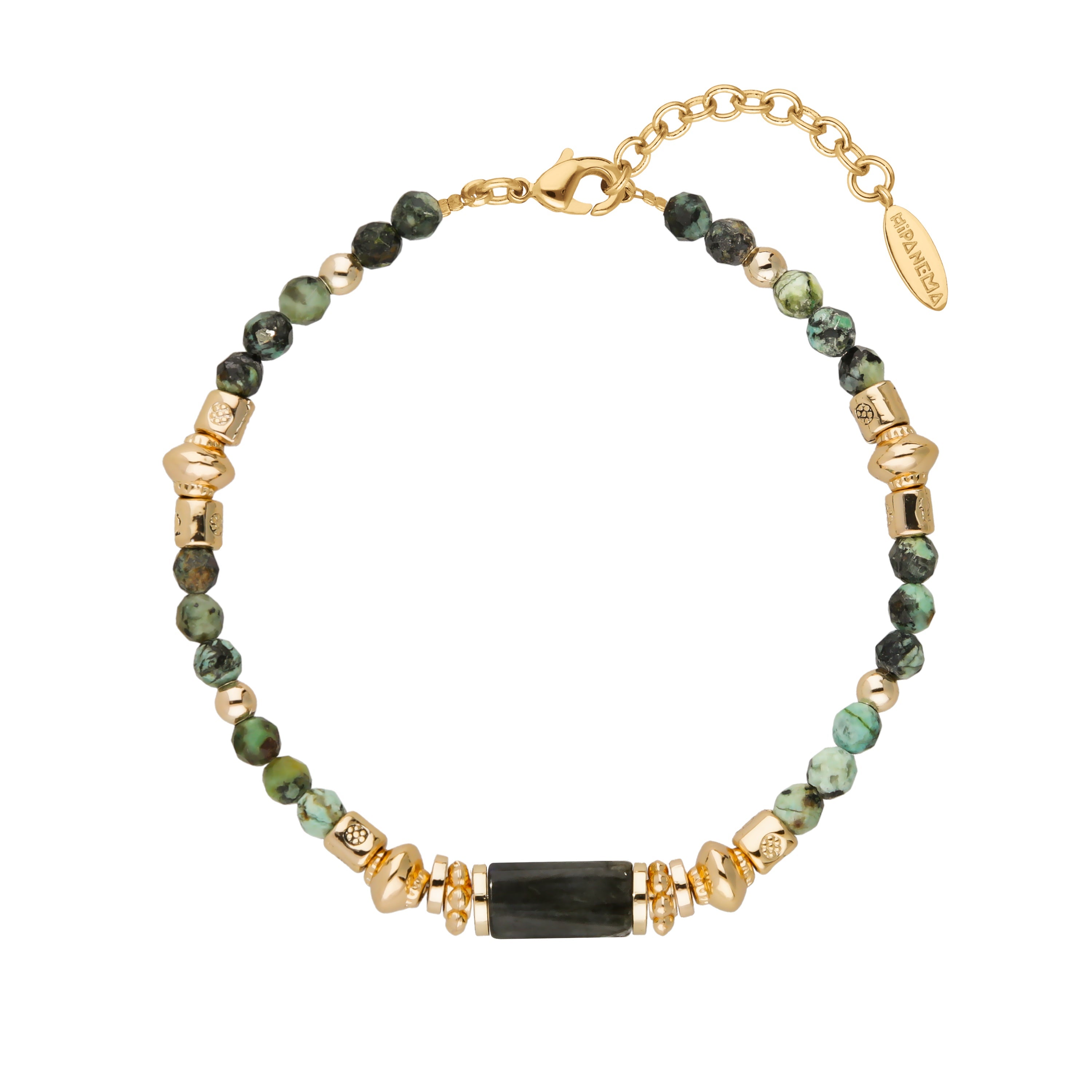 Bracelet gilded with fine 18 carat gold, composed of semi-precious stones in turquoise, adorned with a labradorite in its center. Four parts in golden rings bring rhythm to the composition. The original and essential bracelet, to wear alone or in accumulation.