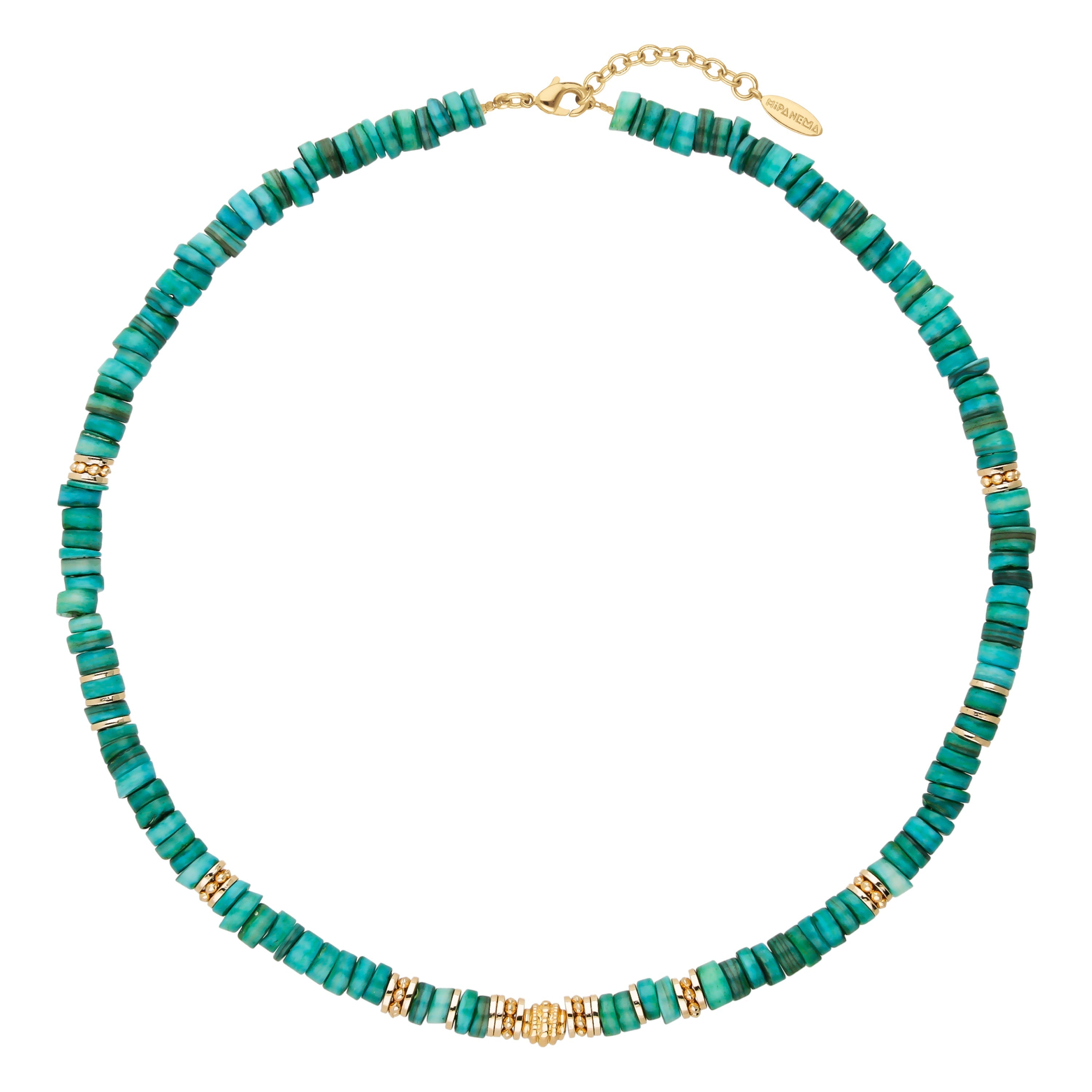Immerse yourself in the Pacific blue of our Allegra necklace. Sophistication and authenticity for this necklace made of semi-precious stone washers: we like this alternation of blue labradorite and amazonite in its center and golden, smooth or ball-shaped washers to break up the regularity of the bracelet. Four small, lighter green beads in the center of the bracelet elegantly structure the entire assembly. It is gilded with fine 18-carat gold.
