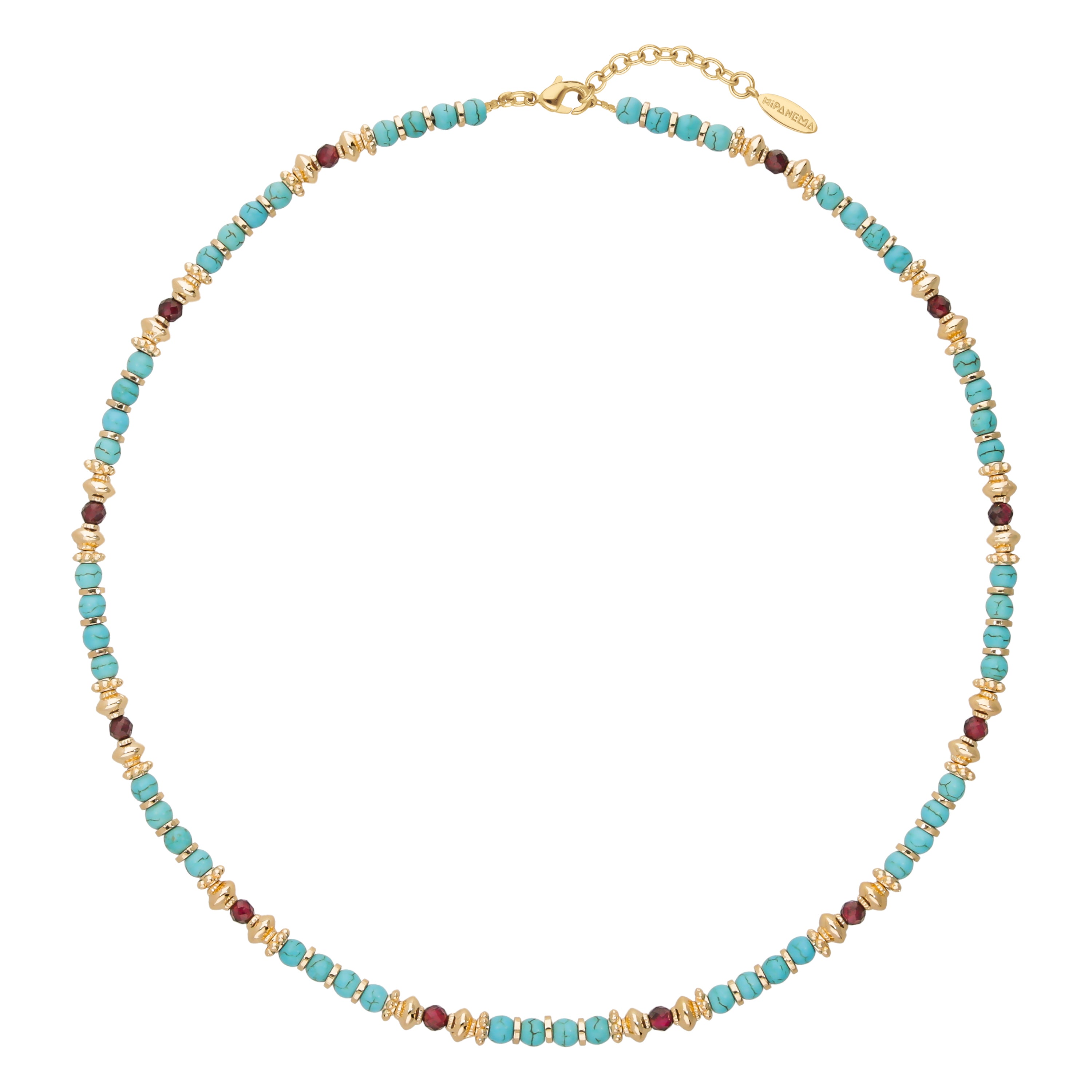 Straight from the remains of an ancient city, this delightful necklace revisits our know-how made in Hipanema. We love this combination of round turquoise beads and faceted garnet beads, all separated by 14-carat gold washers. The bohemian, summery, chic and precious bracelet, to wear alone, in accumulation or as a set.