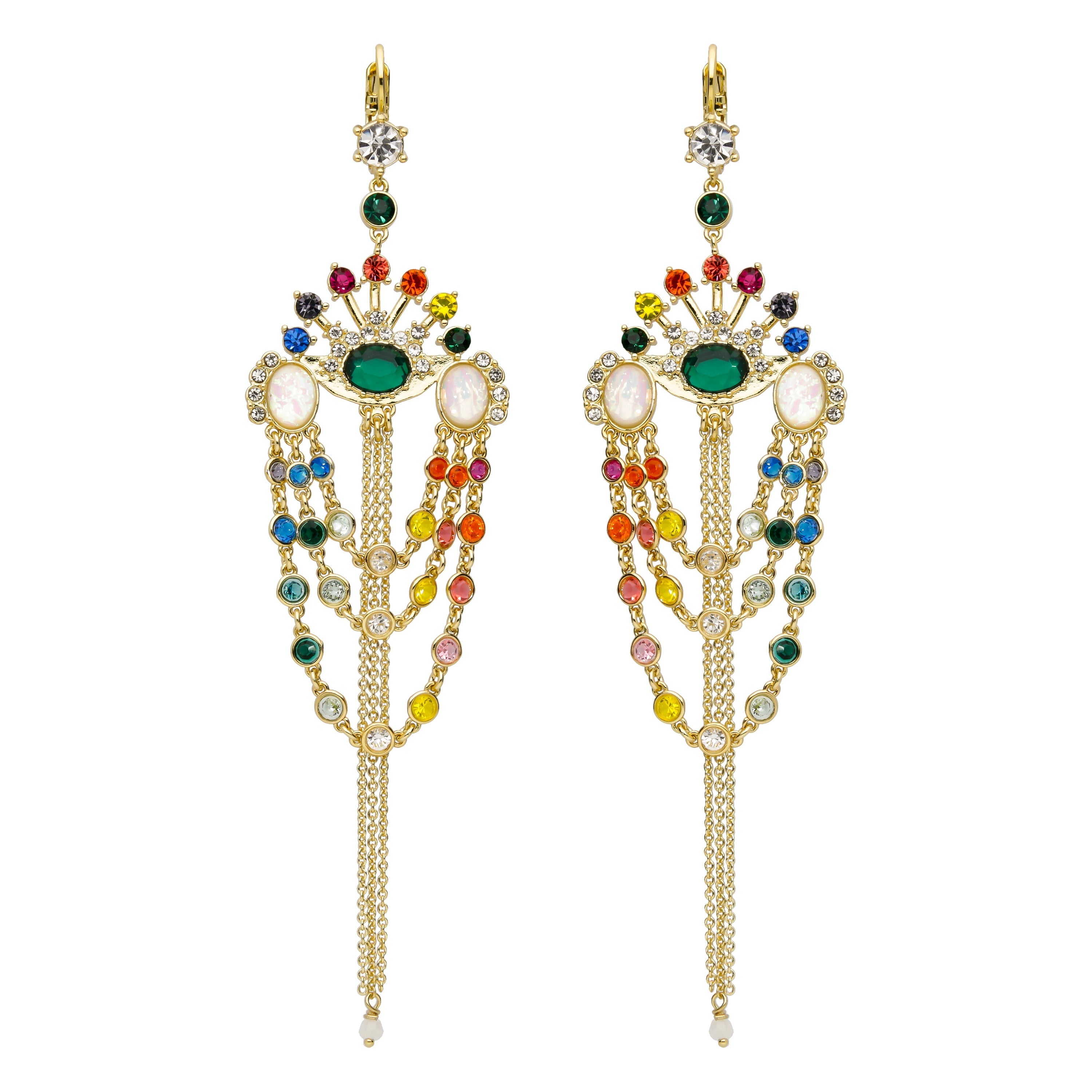 The sunny masterpiece made in Hipanema! Totem earrings mounted on sleepers for pierced ears, gilded with fine 14-carat gold, on which we find three elements: a golden buckle head delicately worked in a vintage style, adorned with a black onyx-effect cabochon, overlooking a medallion crafted, recomposed of Miyuki beads in neon orange, coral, turquoise, black, red and pink tones, alternating with lines of glitter rhinestones. A third round and ornate piece, like a solar disk in rainbow tones, completes the composition. We love the play of pearl cascades on either side of the jewel, in a dynamic and joyful Rainbow gradient. The exceptional earrings, which transform every occasion into a great occasion.