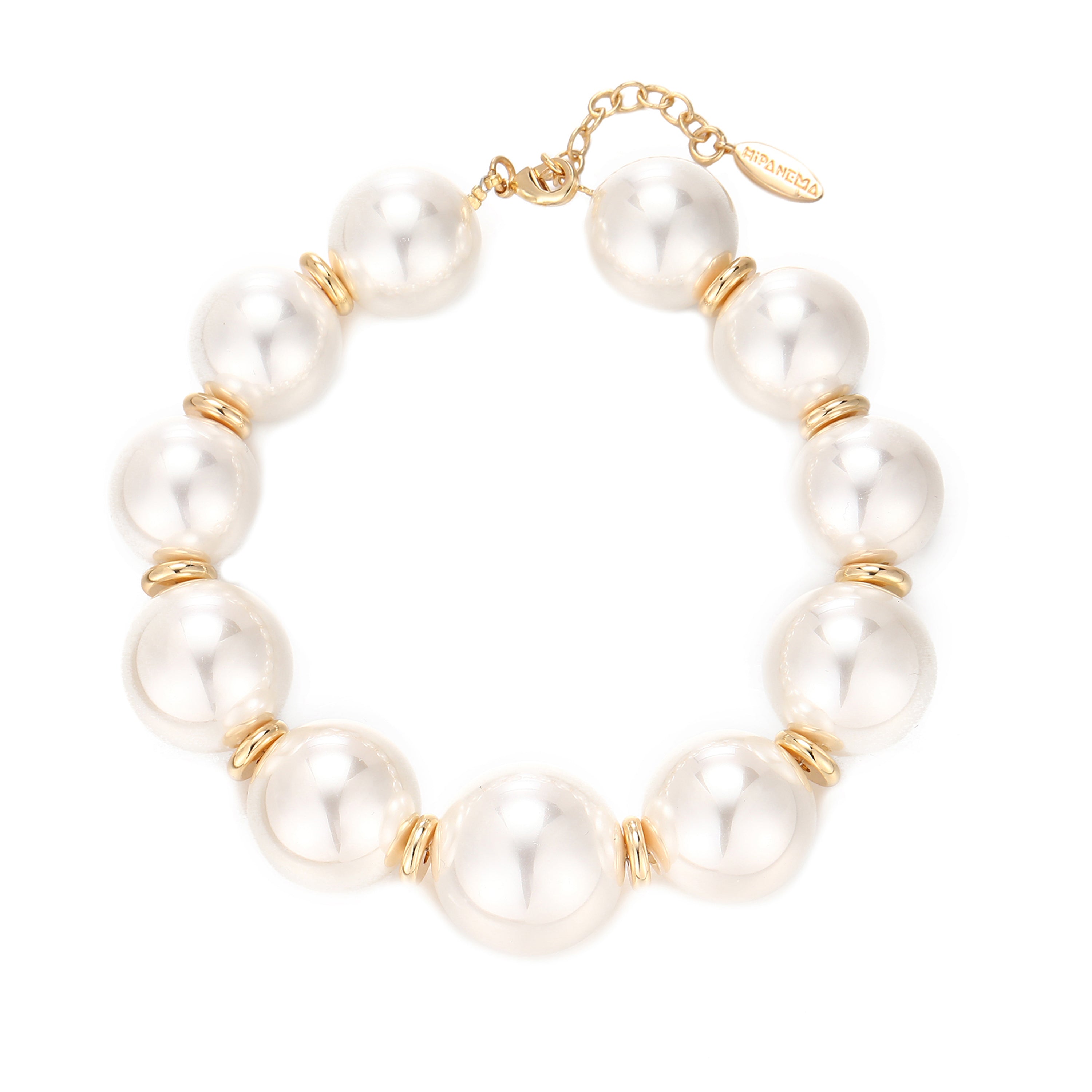 Hipanema twists the codes with its bracelet of XXL pearl-style pearly spheres, each separated by a golden disc.