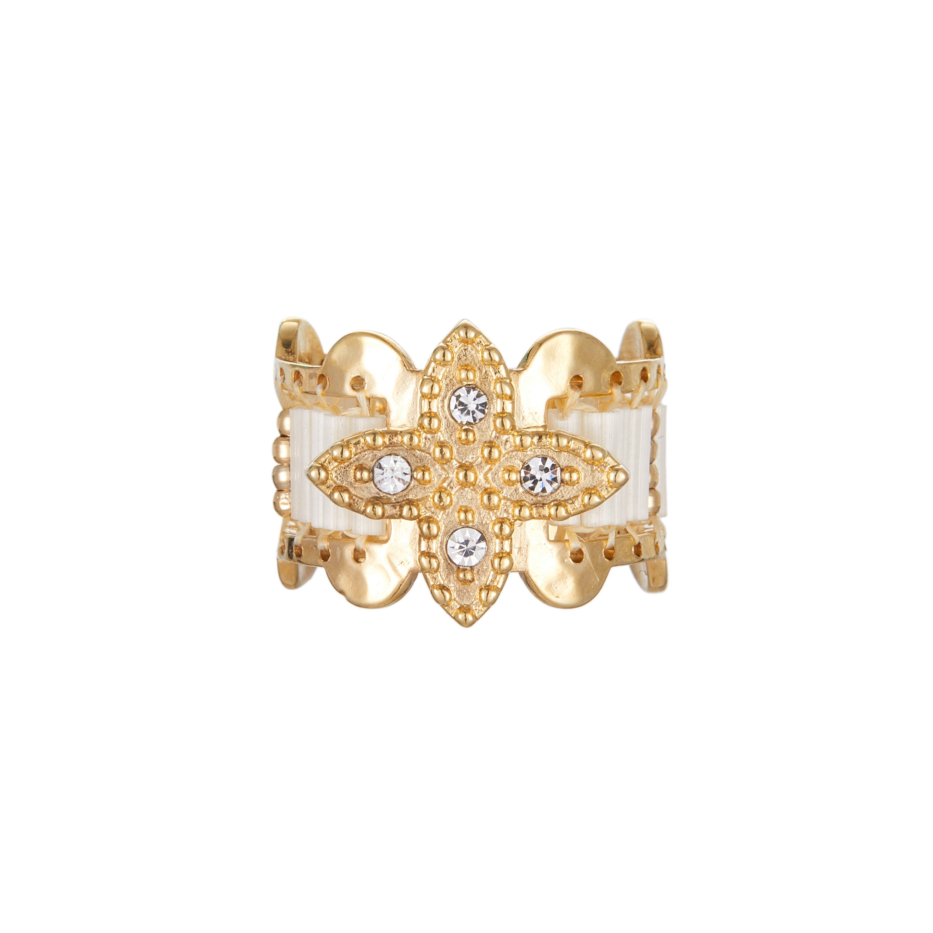 Opulent ring gilded with fine 14 carat gold. It is entirely embroidered with mother-of-pearl effect tube beads, with a clover cabochon paved with rhinestones in its center. Open back to accommodate multiple sizes.