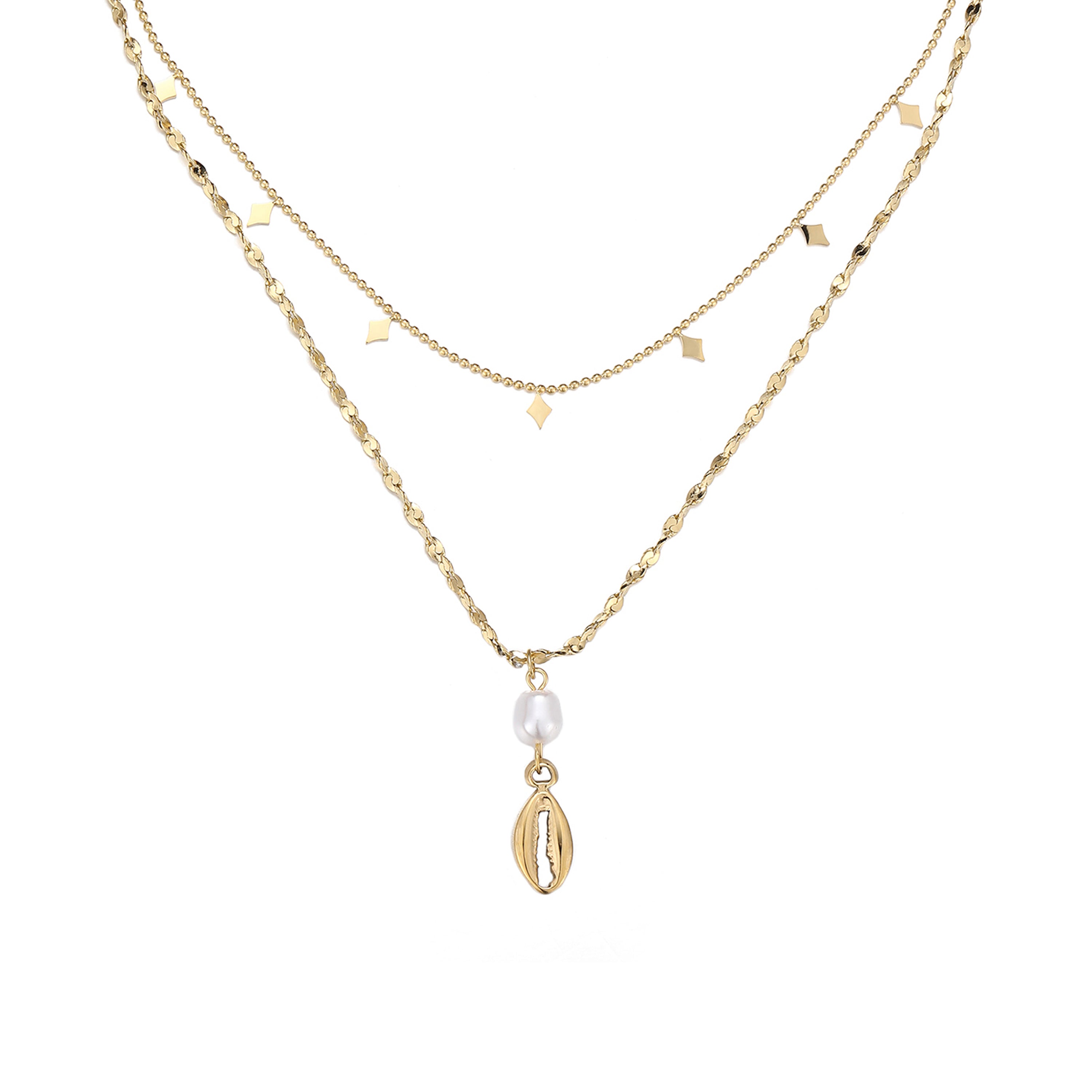 Double-row necklace in surgical steel: a small golden ball chain and small diamonds adorn the neckline, as well as a delicate faceted twist chain. Adorned in its center with a small pendant fitted with a cultured pearl effect pearl and a small cowrie shell.