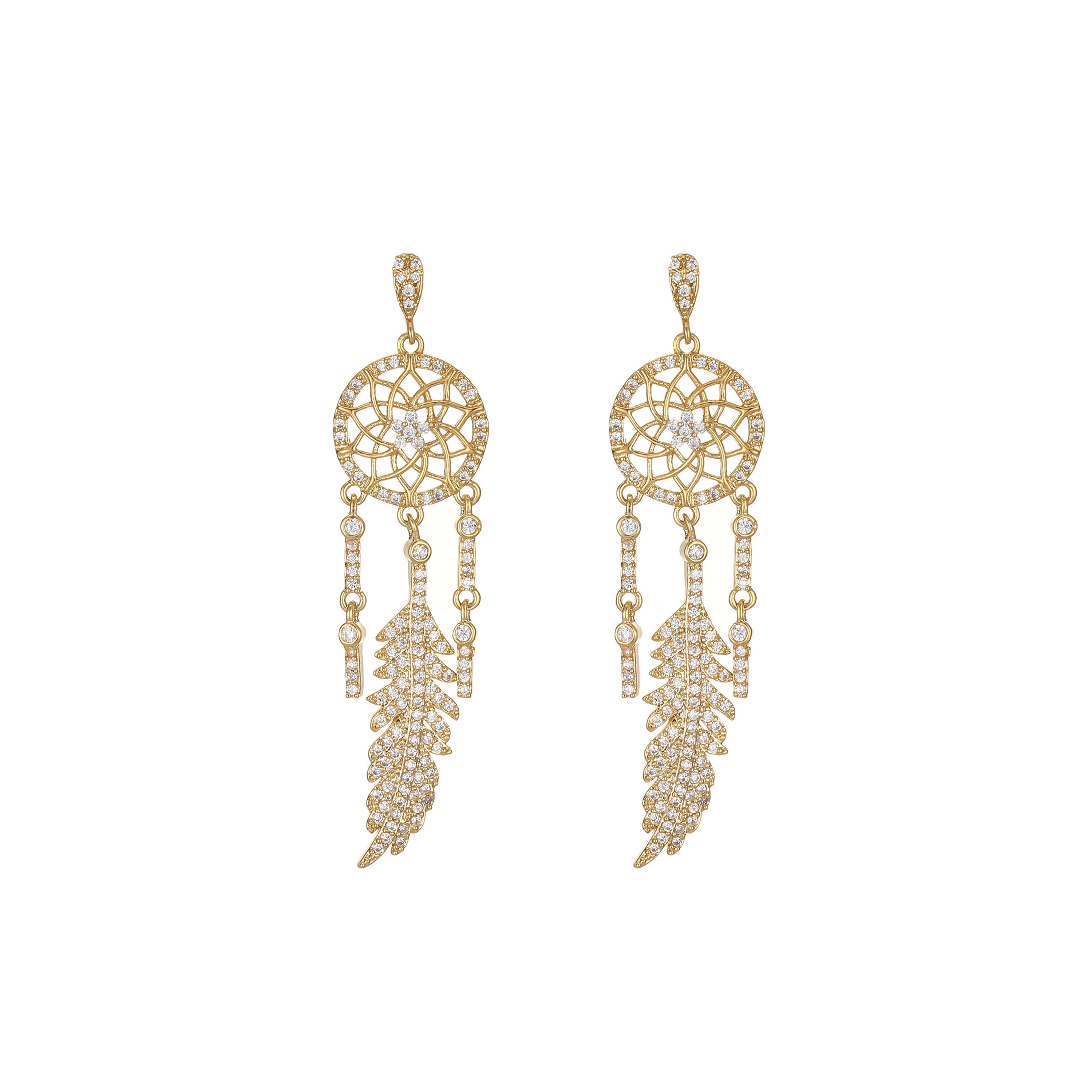 Gypsy atmosphere for our fine gold dangling earrings, inspired by the dreamcatcher: a rosette with a large feather in the center, surrounded by small pendants paved with rhinestones.