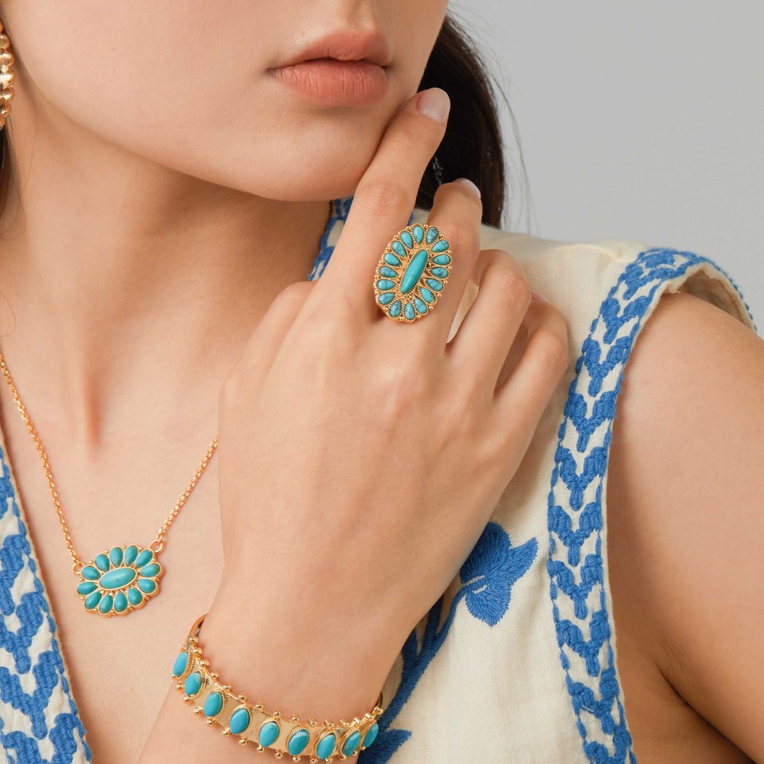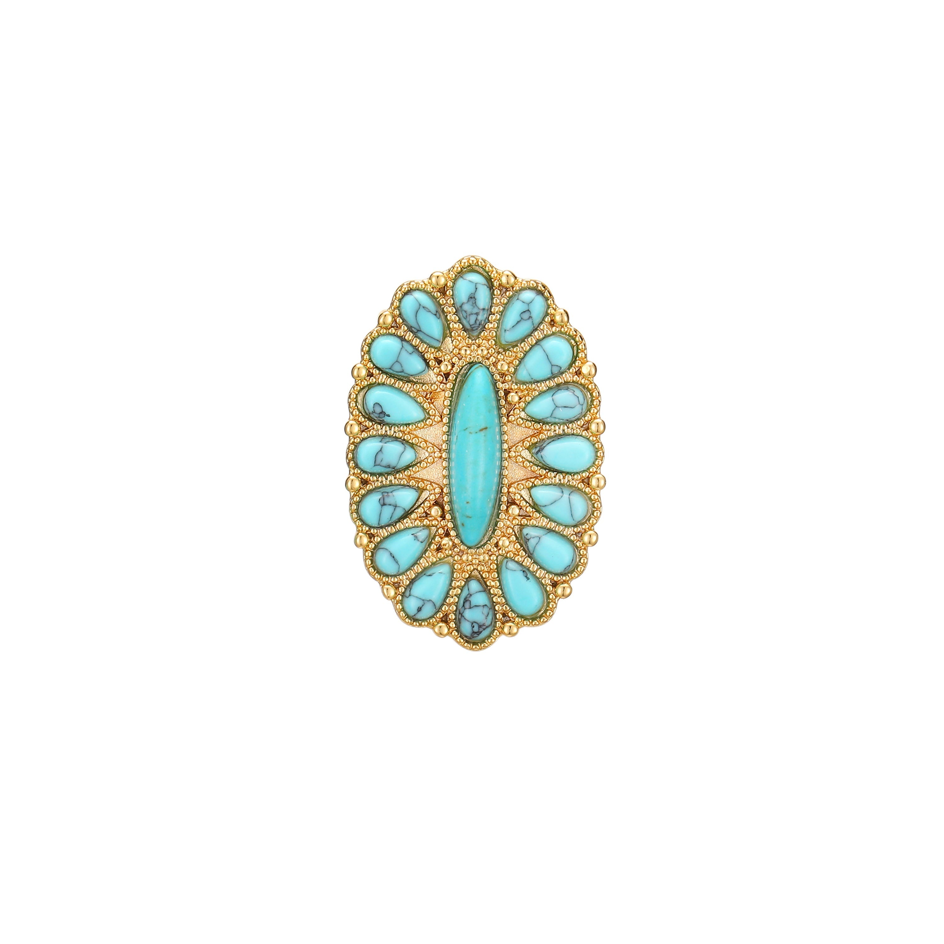 Massive and elaborate golden ring, inspired by Zuni Navajo codes, where we find on this ornate oval small drops of turquoise-effect resin, with an elegant turquoise-effect stone in the center. Adaptable to all sizes.