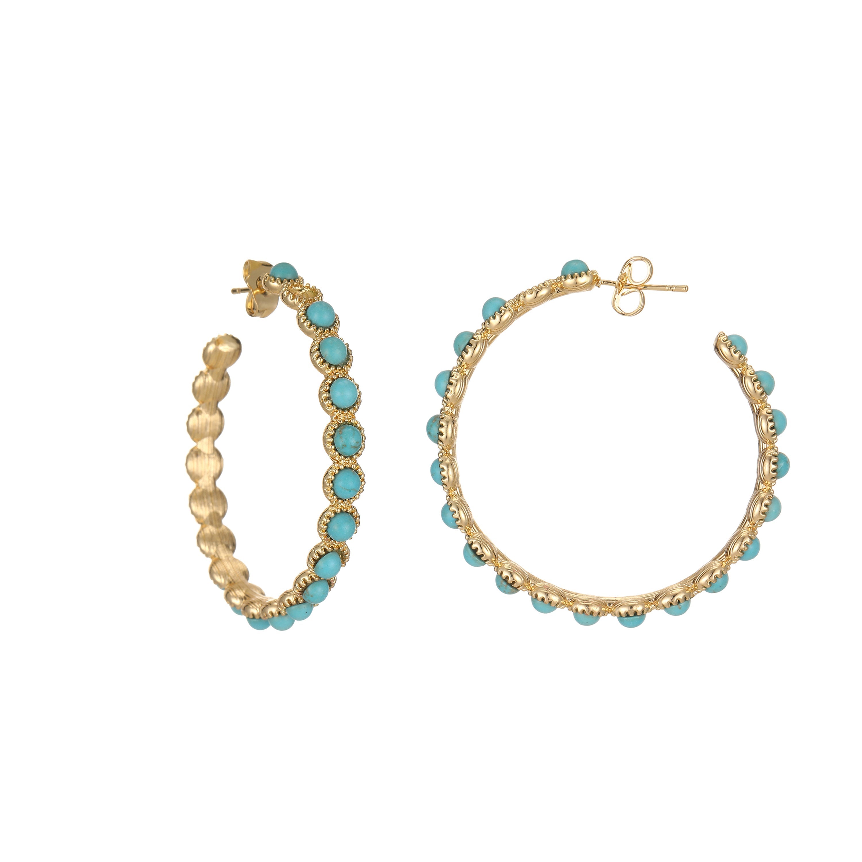 Hoop earrings gilded with fine gold enhanced with small sunburst-style cabochons, with turquoise-effect ball beads in the center.