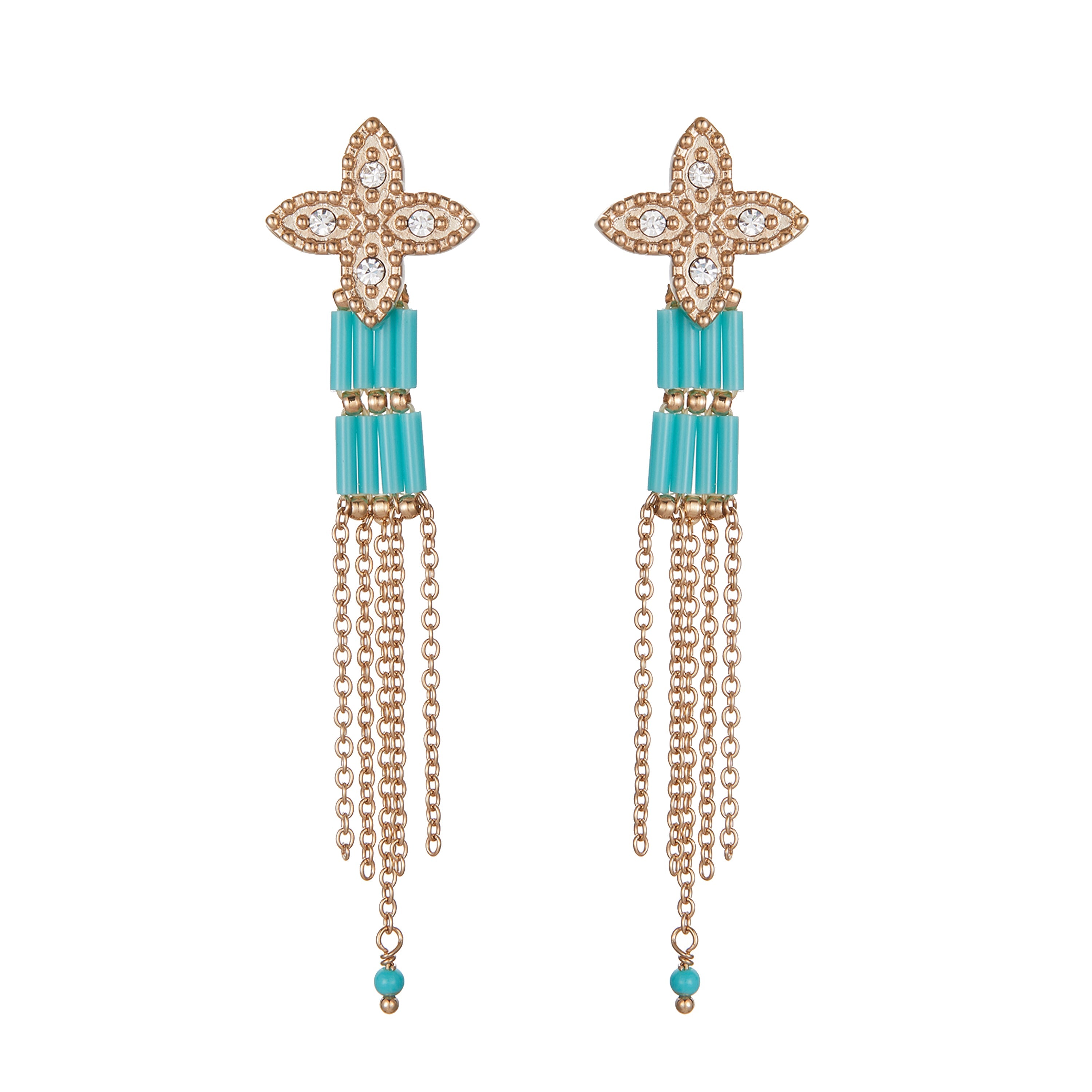 Drop earrings gilded with fine gold, with an elongated four-leaf clover at the head of the earrings, decorated with small rhinestones, overlooking cascades of five chains made up of turquoise-effect tube pearls and small golden pearls, with a very small turquoise bead that completes the rhythm. We love these sexy and feminine earrings.