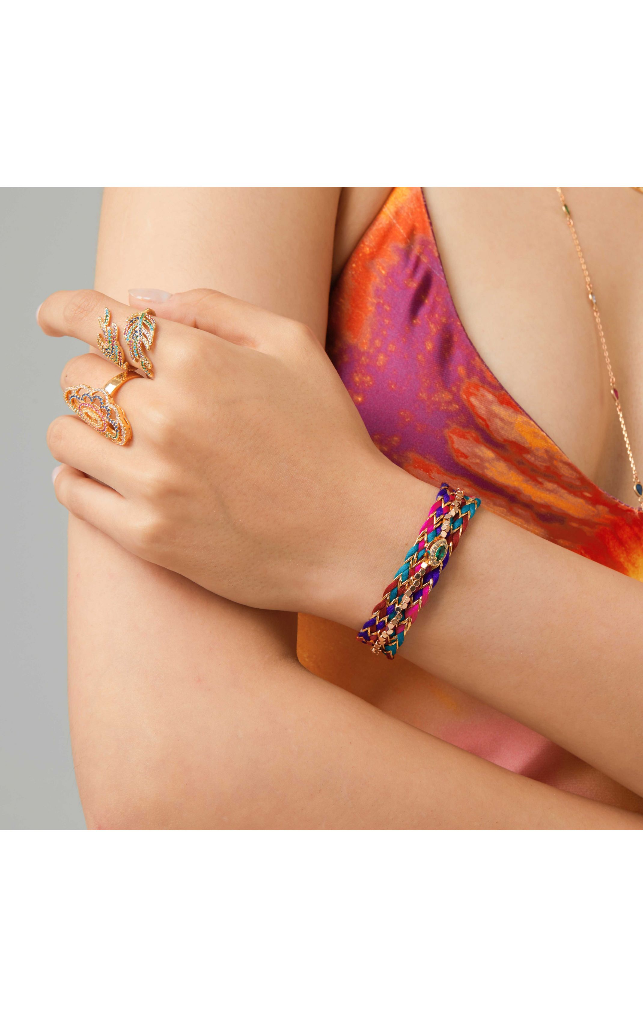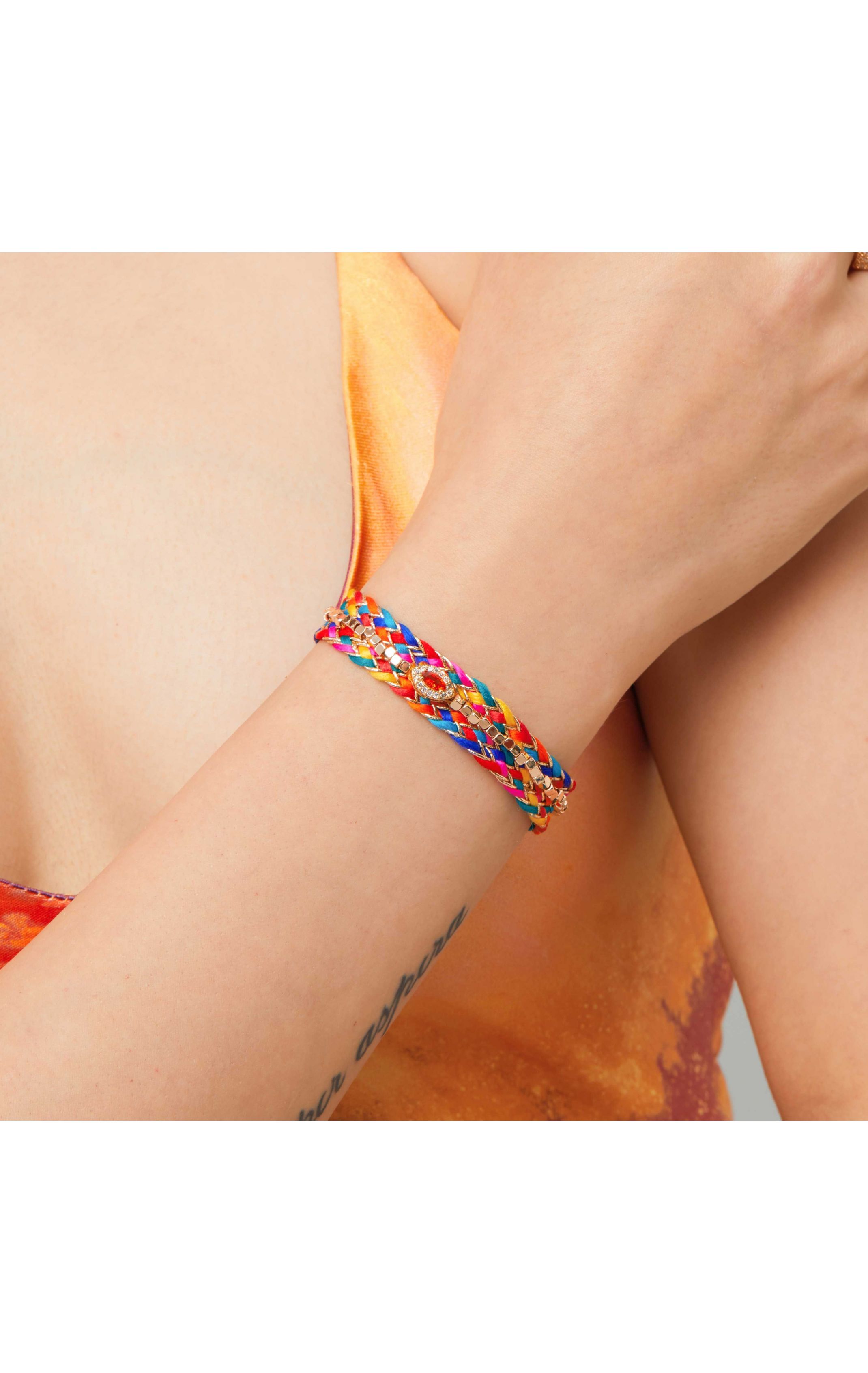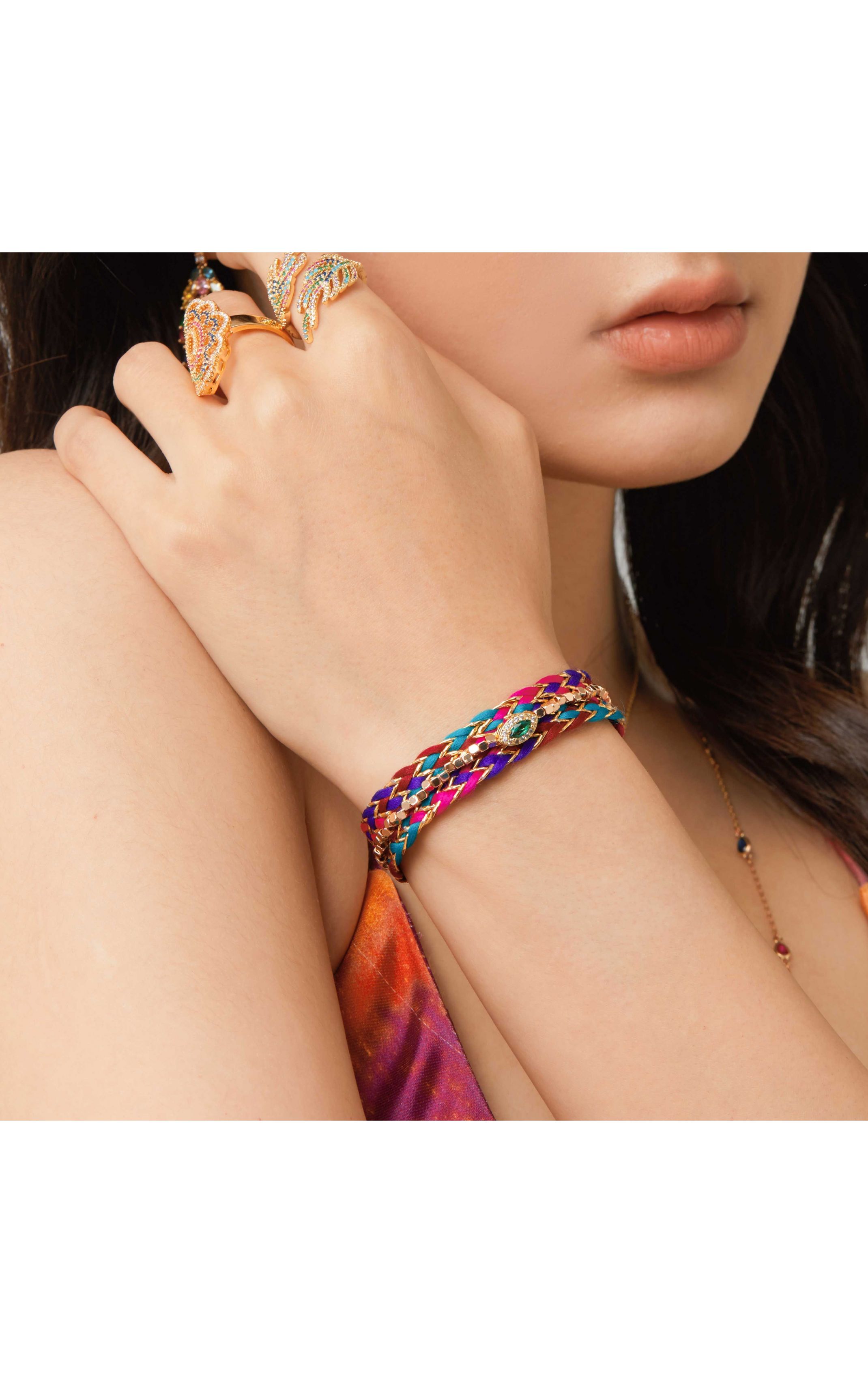 Braid bracelet in fuchsia, purple, emerald green, gold and burgundy colored ribbons. In its center, a small tassel paved with diamond-effect rhinestones, with a green emerald-effect central marquise. It is embroidered with small faceted golden beads. Cuff type magnetic clasp.