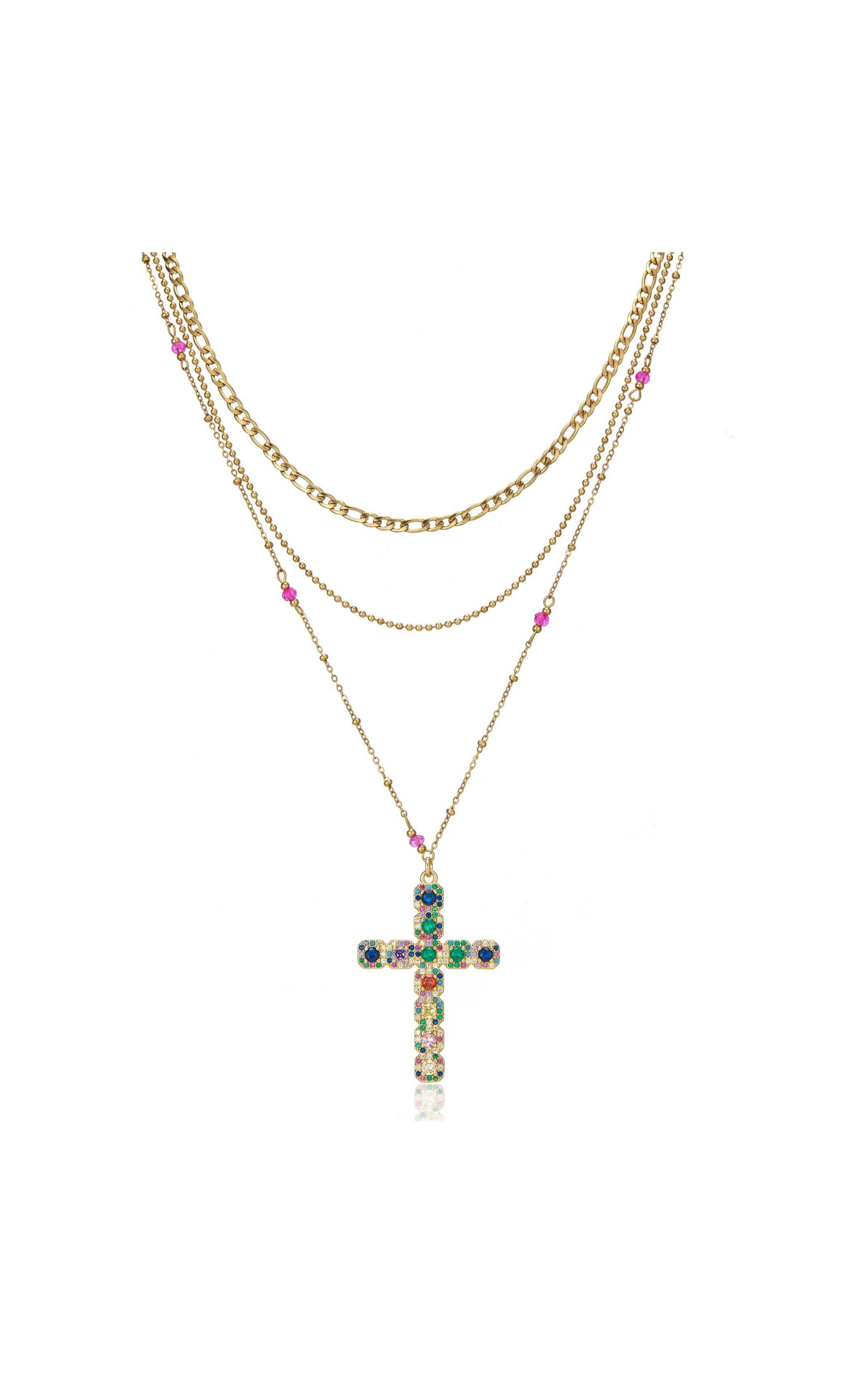Bohemian gypsy atmosphere with our three-row long necklace, in surgical steel. We love this rosary chain decorated with small fuchsia ball beads for a touch of summer color, with its large, fully rhinestoned rainbow cross in an ultra-baroque spirit.