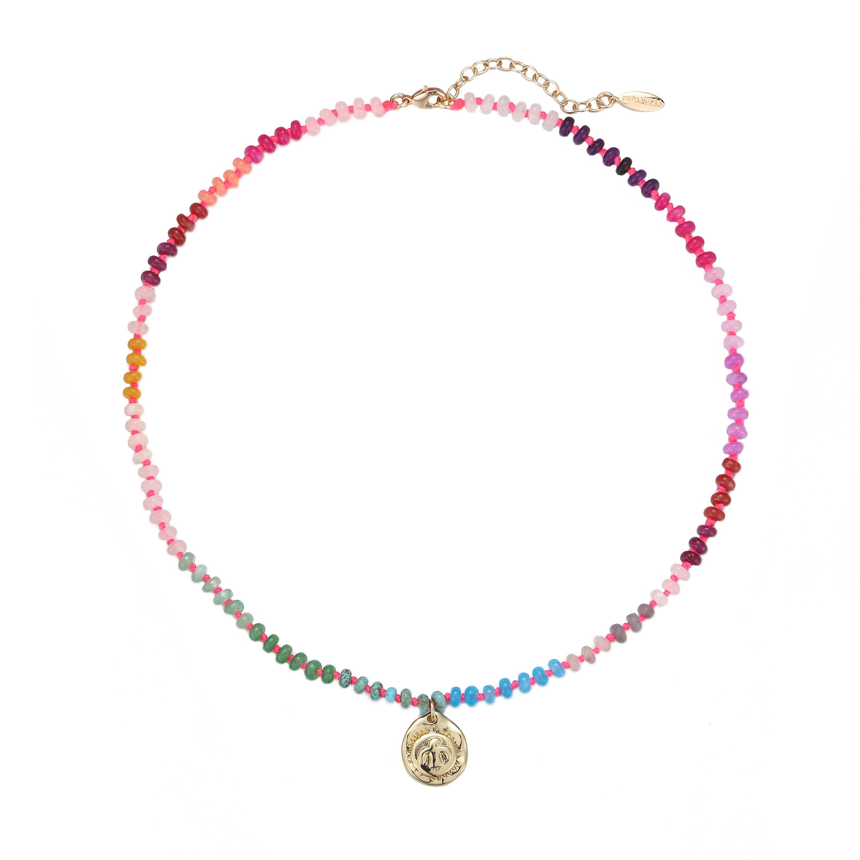 Necklace made of stones in a rainbow gradient. In its center, an asymmetrical hammered coin effect medal representing a dove. We fell in love with this assembly on a neon pink thread, tied between each stone, enhancing the solar side.