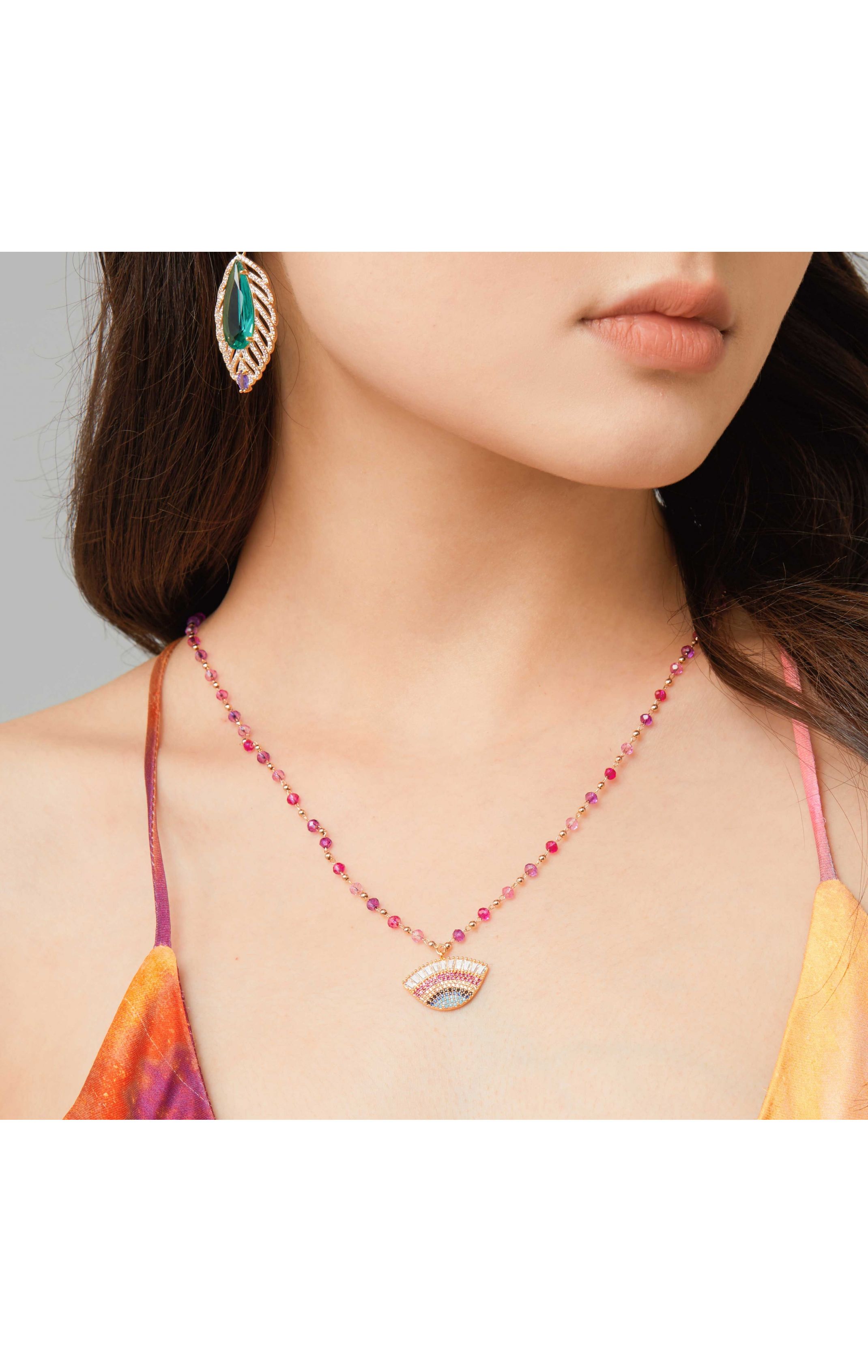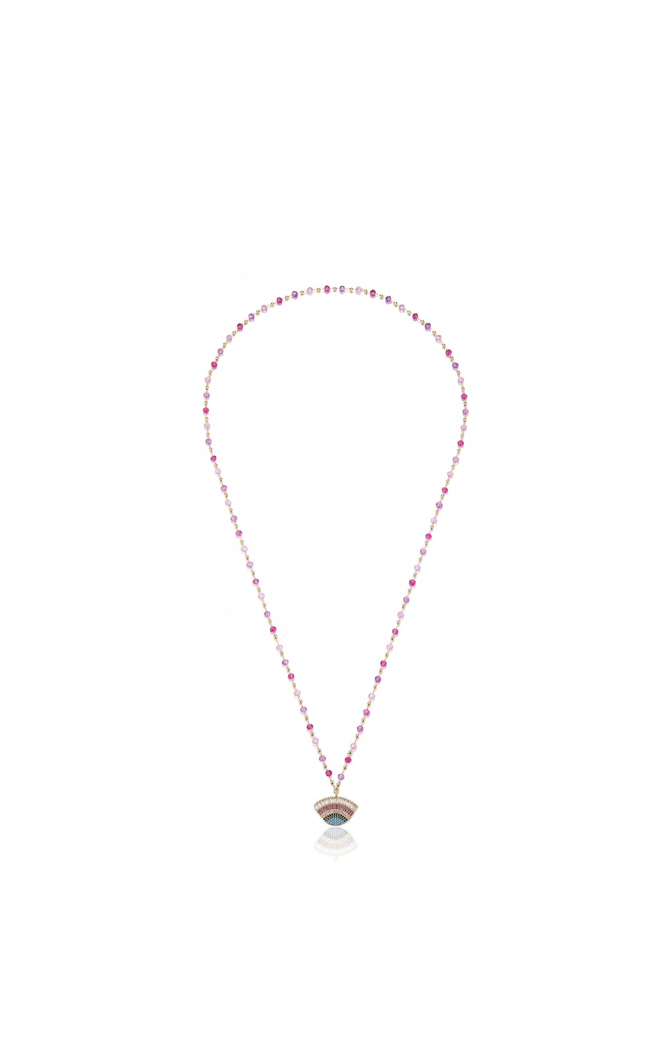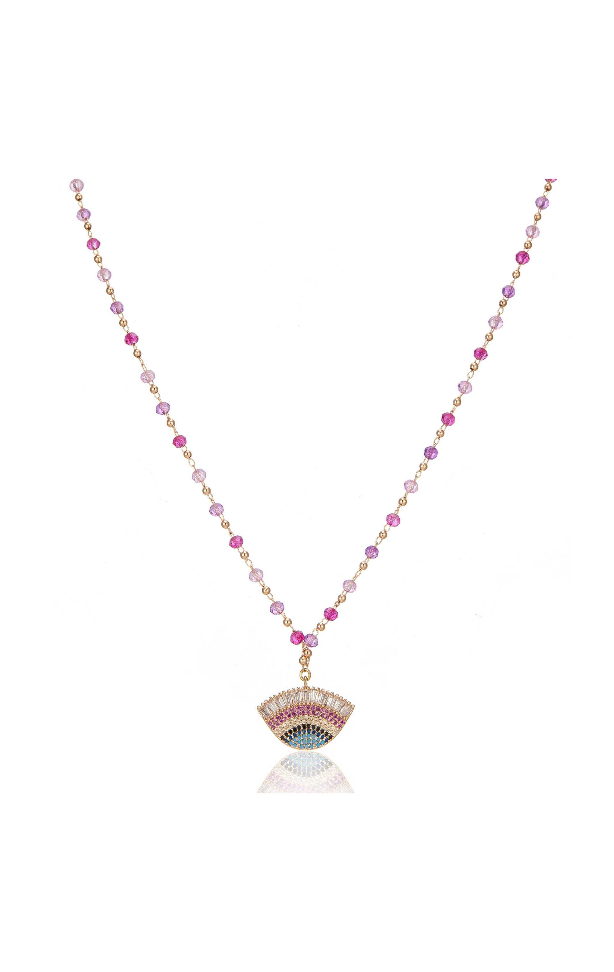 Lovely necklace to enhance your neckline: mounted on a medium-length rosary chain, we discover a pretty fan-shaped pendant, a sort of protective eye, in a variation of colored rhinestones: purple, pink, fuchsia, turquoise blue with diamond effect, enhanced of baguette diamond effect rhinestones to accentuate the eyelash effect.