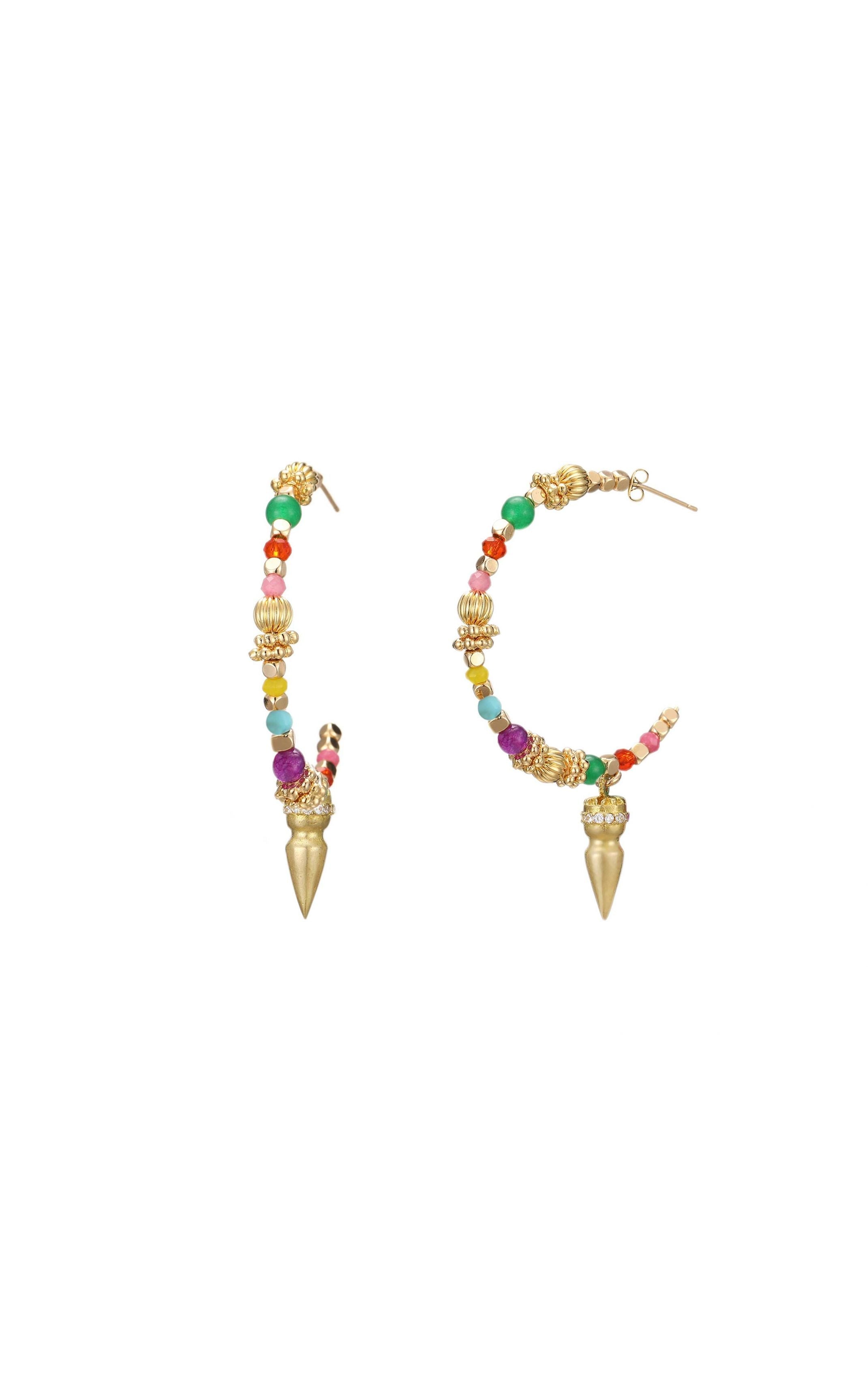 Open hoop earrings gilded with fine gold, composed of pearls strung in a multicolored rhythm of real stones, with a rhinestone pendulum effect tassel.