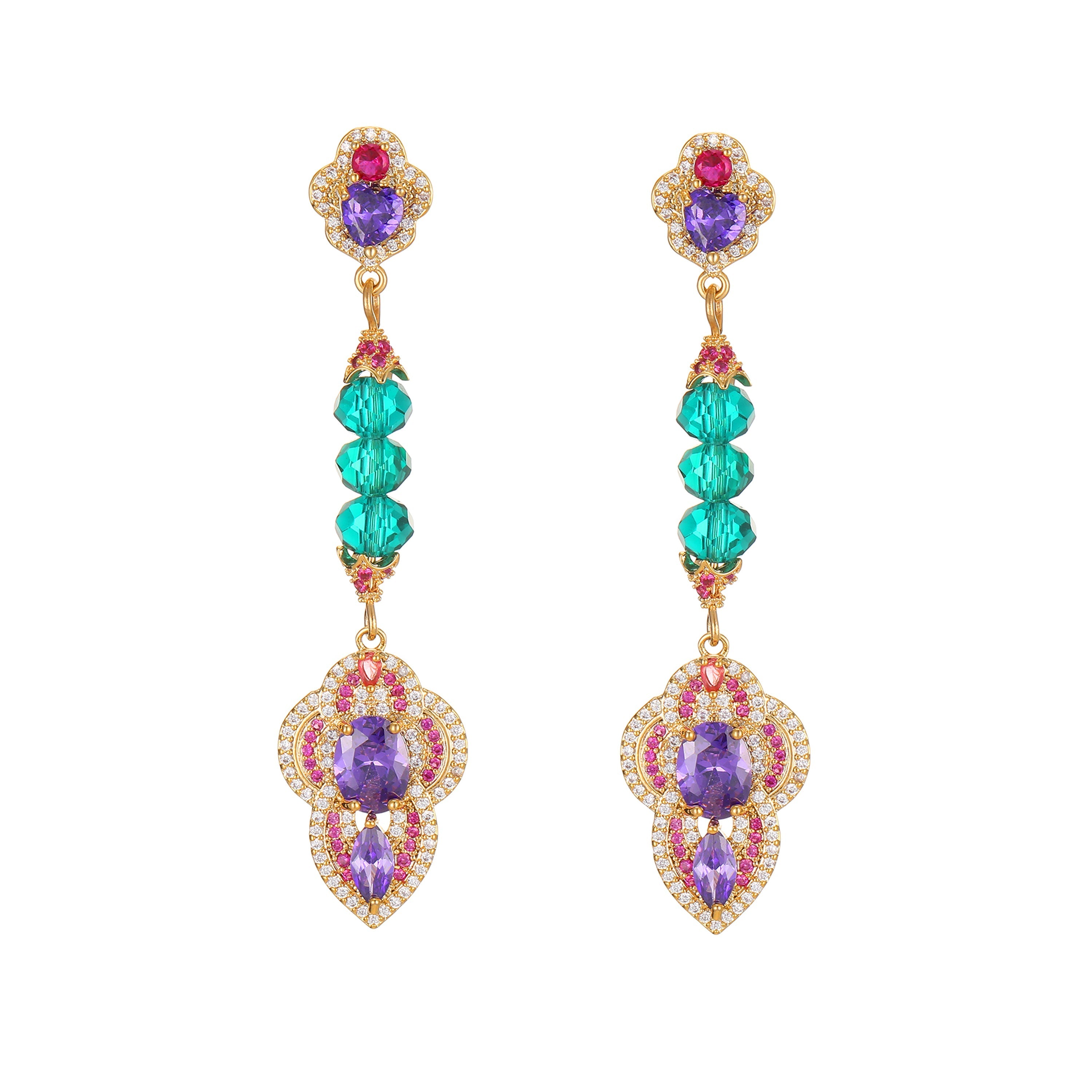 Dare to wear chic bling with our very baroque ornate drop earrings. On the buckle head paved with diamond-effect rhinestones, a small amethyst and ruby-effect heart, followed by three large emerald-effect green pearls. We love this pendant cabochon with the shape of a lily leaf, adorned with a large pearl with an amethyst effect center, all paved with diamonds for a very precious look.