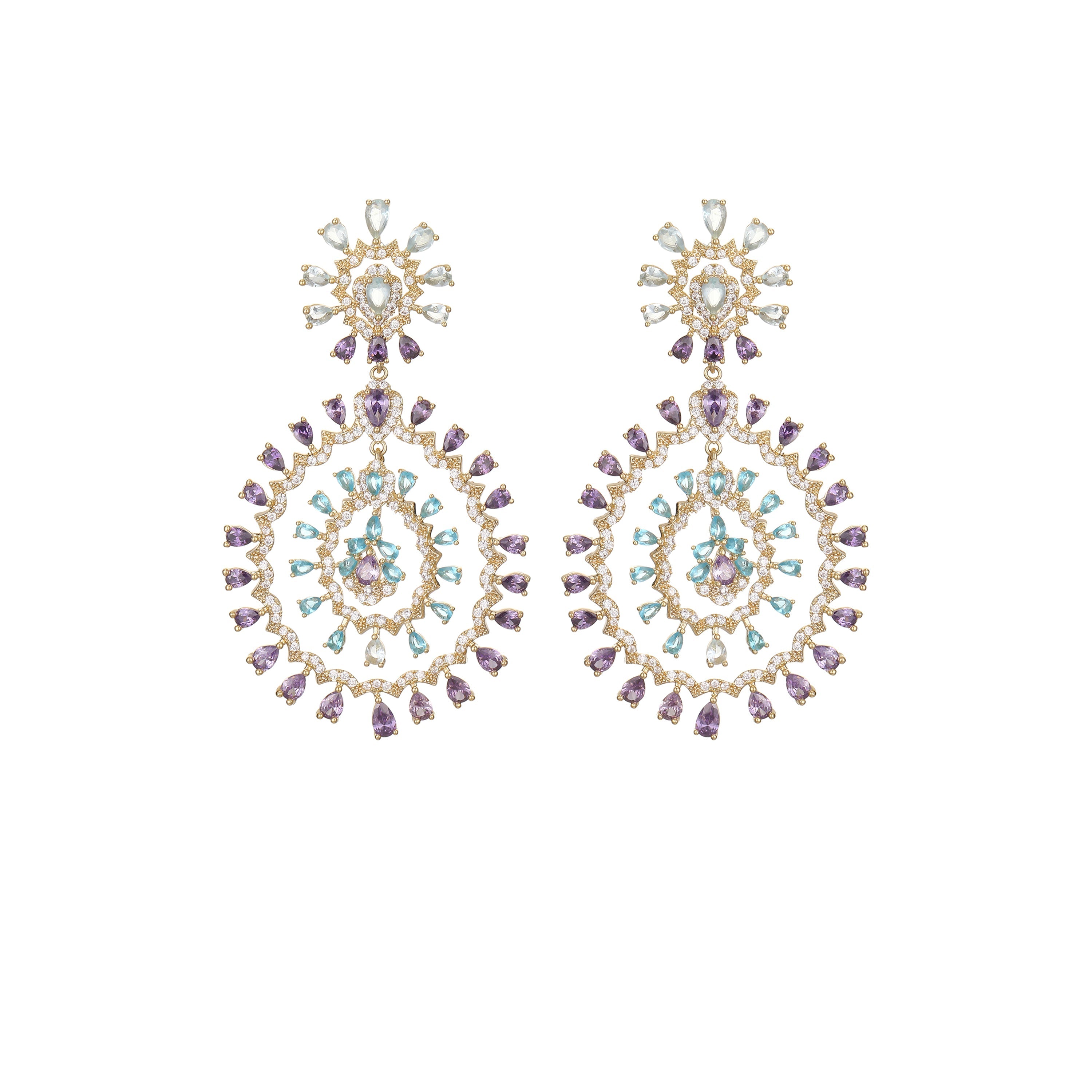 Very imposing hoop effect earrings, composed of two circles and a flower-inspired earring head, with this lace side, on which we find light blue aquamarine effect or purple amethyst effect rhinestones, all dotted of diamond effect crystals. We love this very uninhibited baroque side of costume jewelry which is great for summer.