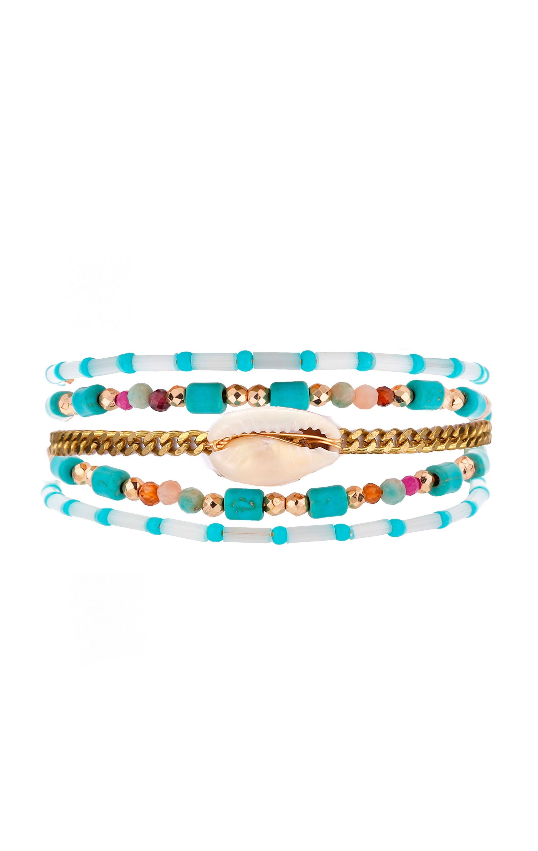 We continue to travel, sailing between the marine horizon and mysterious shores, and we literally fall for this multi-link cuff gilded in fine gold that dares with audacity, reflecting the essence of Hipanema. It combines a gourmette chain adorned with a cowrie shell, links of turquoise seed pearls and delicate Miyuki tube pearls. A casual, sunny style we're all dreaming of having on our wrist this summer!