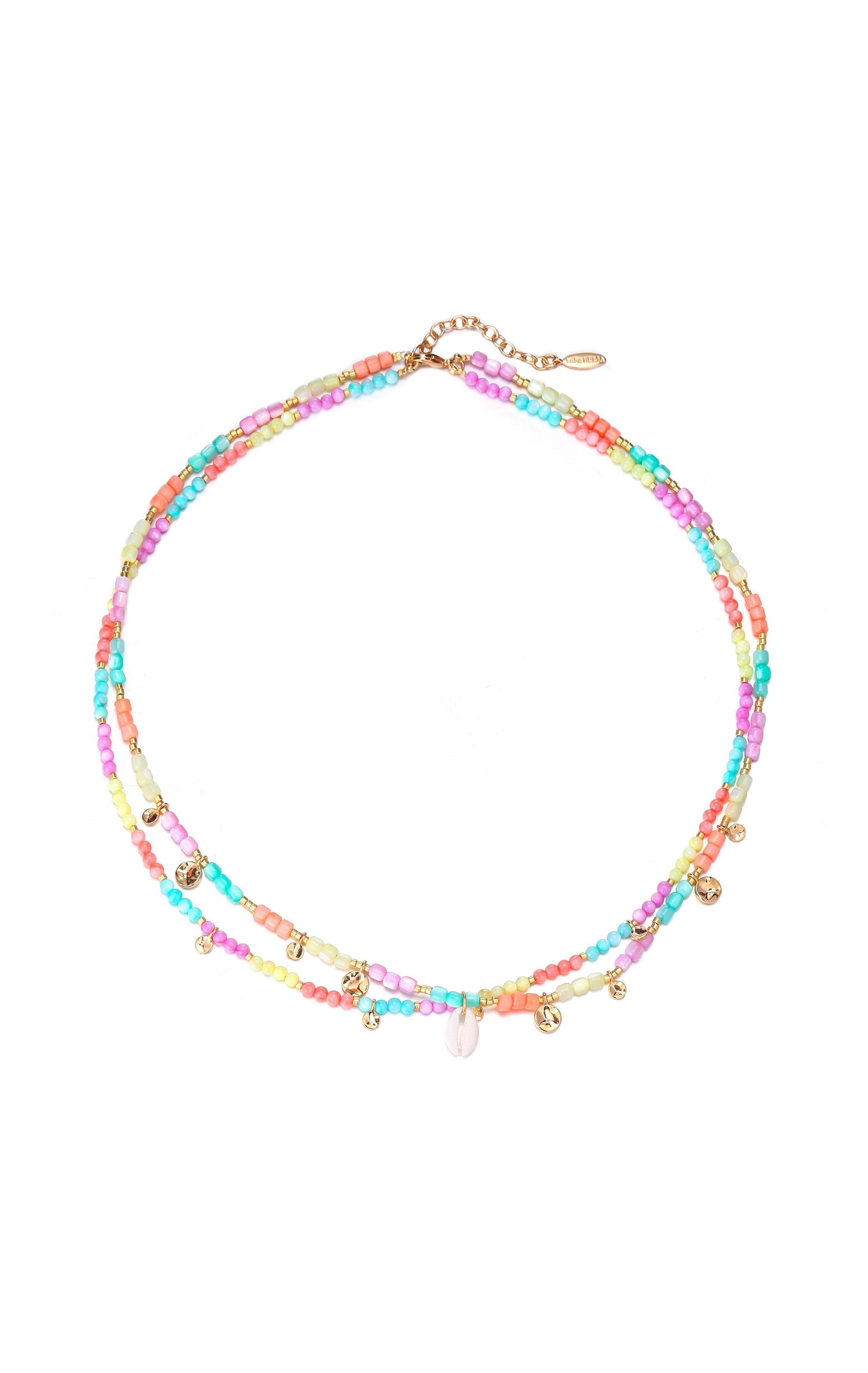 If summer were a jewel, this would be it! This double-row, choker necklace, in acidic colors, lightly embodies the sweetness of vacations, lapping waves, seashores, sea spray, sand slipping through our fingers and summer skies ablaze. Pretty gold-plated bells adorn the necklace's two rows, and the cowrie shell, an emblematic piece of our theme, completes its structure. A timeless summer must-have with a childlike touch that you won't want to leave!