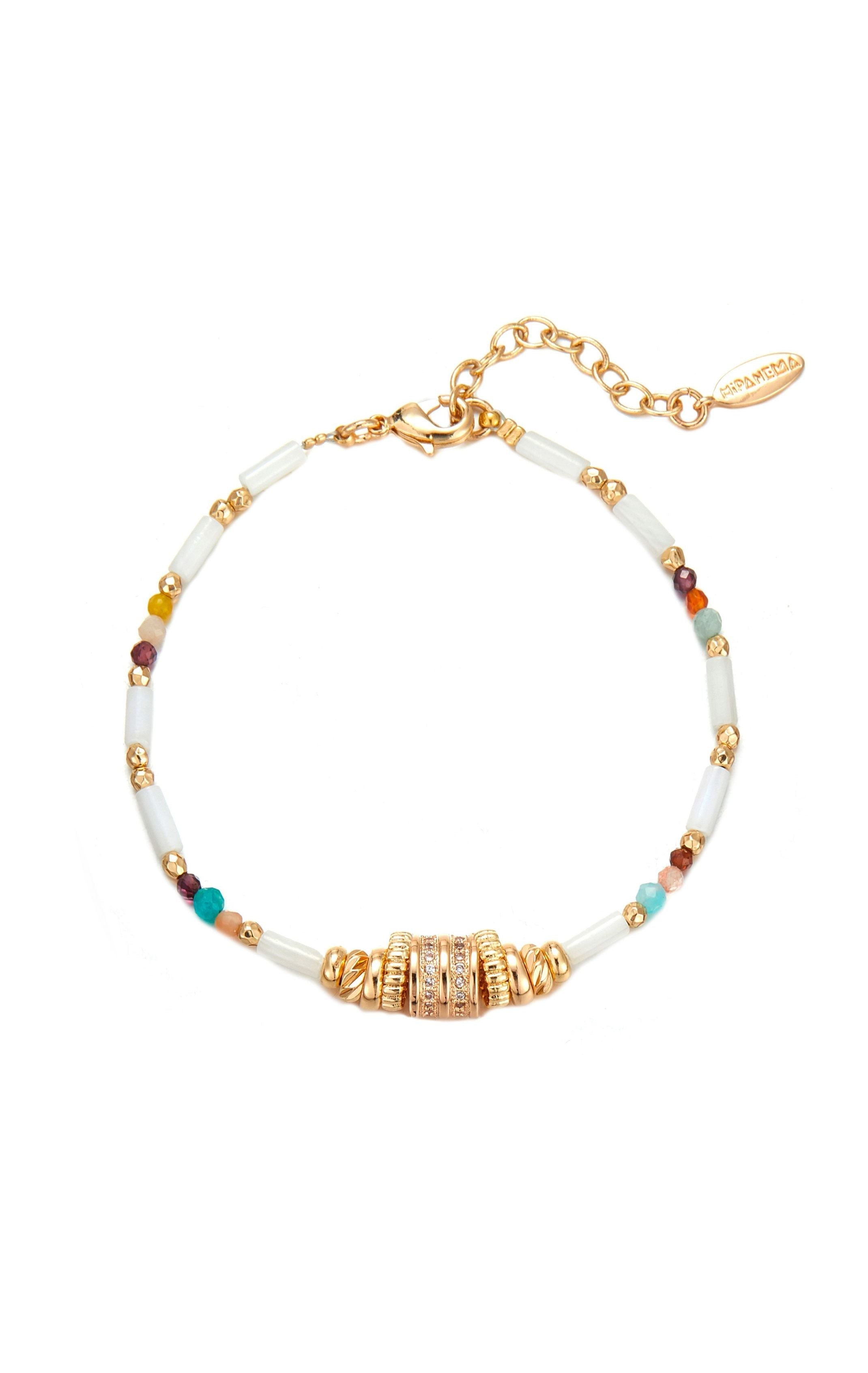 A true declaration of love to the ocean, sea spray and faraway journeys, this theme transports you into the bewitching, radiant world of Hipanema, creatively reinterpreting the brand's emblematic codes. You'll fall head over heels for this adorable bracelet gilded in 14-carat fine gold, with its combination of semi-precious stones in pastel tones. Adorned with an elegant gold-plated centerpiece and set with crystalline zircons, it evokes the gentle murmur of the waves and our love of mysterious shores.