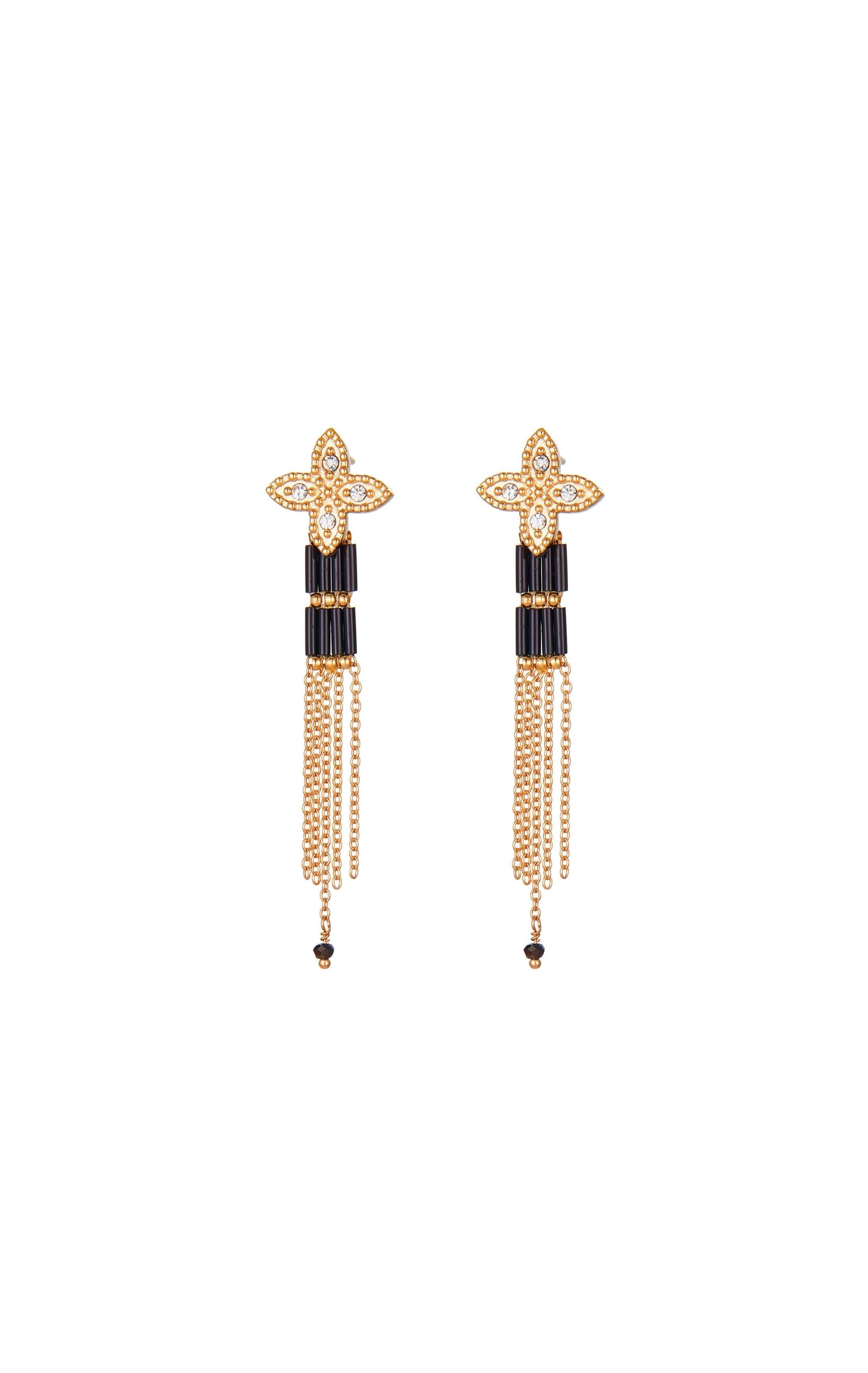 We love these earrings, with their elongated, rhinestone-paved clover-shaped headpiece that looks as if it's been unearthed from the remains of an ancient cathedral. Their cascades of chains topped with black Miyuki tube beads and gold-plated pearls give them a feminine, powerful yet gentle touch. Their length elegantly dresses an open neckline.