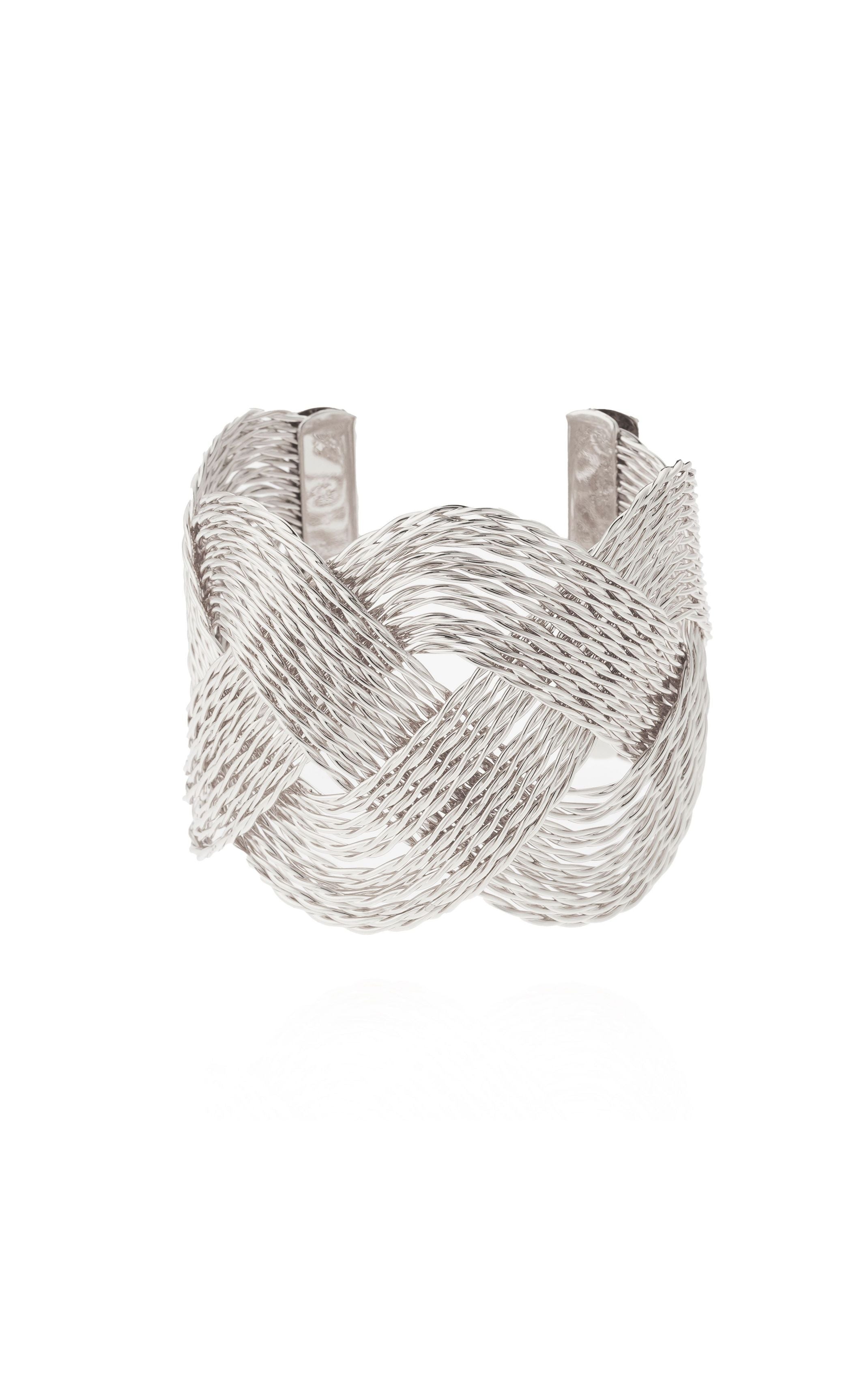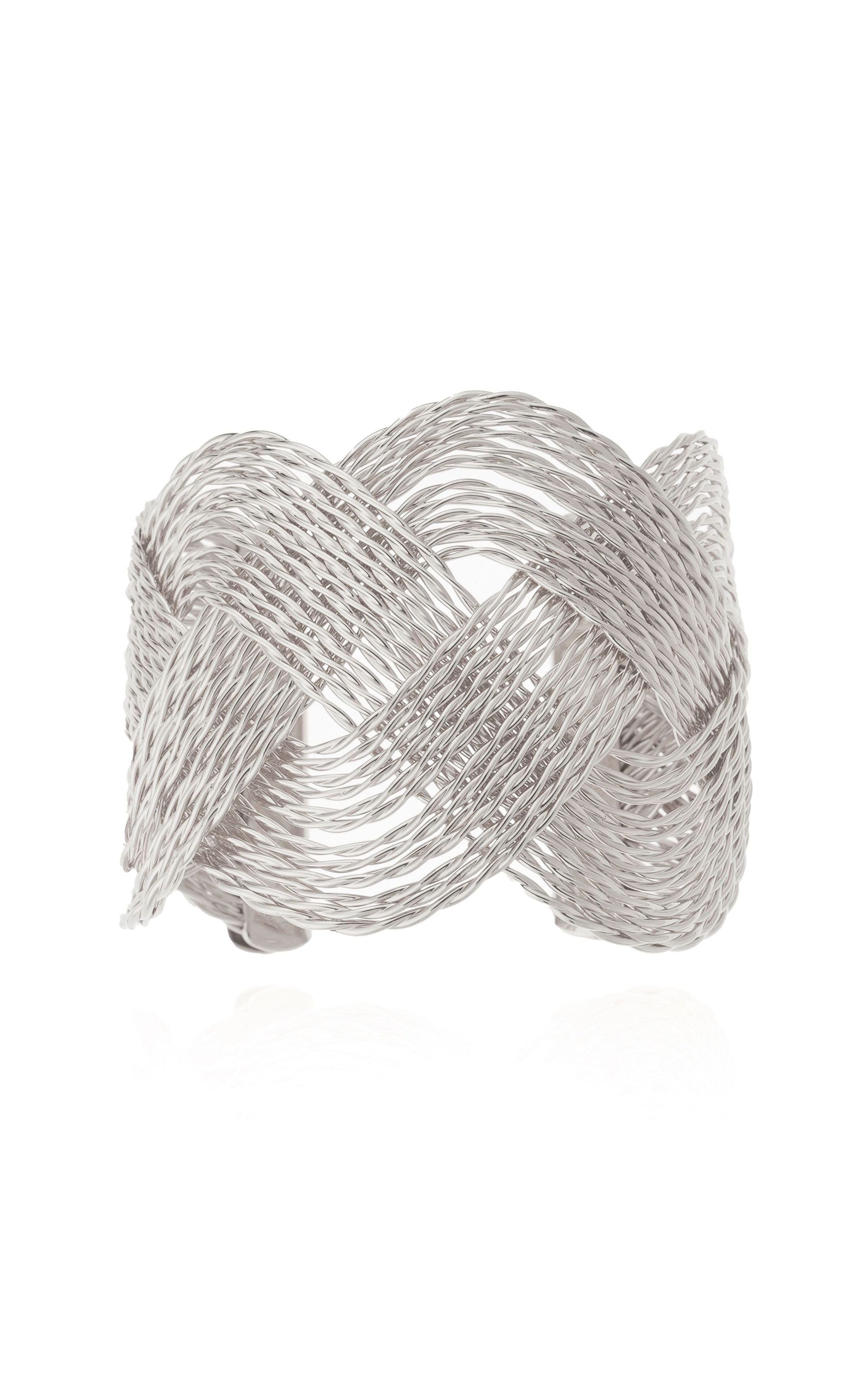 The XXL Katerina cuff stands out as an iconic piece in the Prestige collection, where silver links undulate in a metallic wave motion. Its powerful, graphic lines are skilfully interwoven in an ample, regular pattern, created by hand, making this cuff a spectacular, bold work of art. Adjustable for optimum comfort.