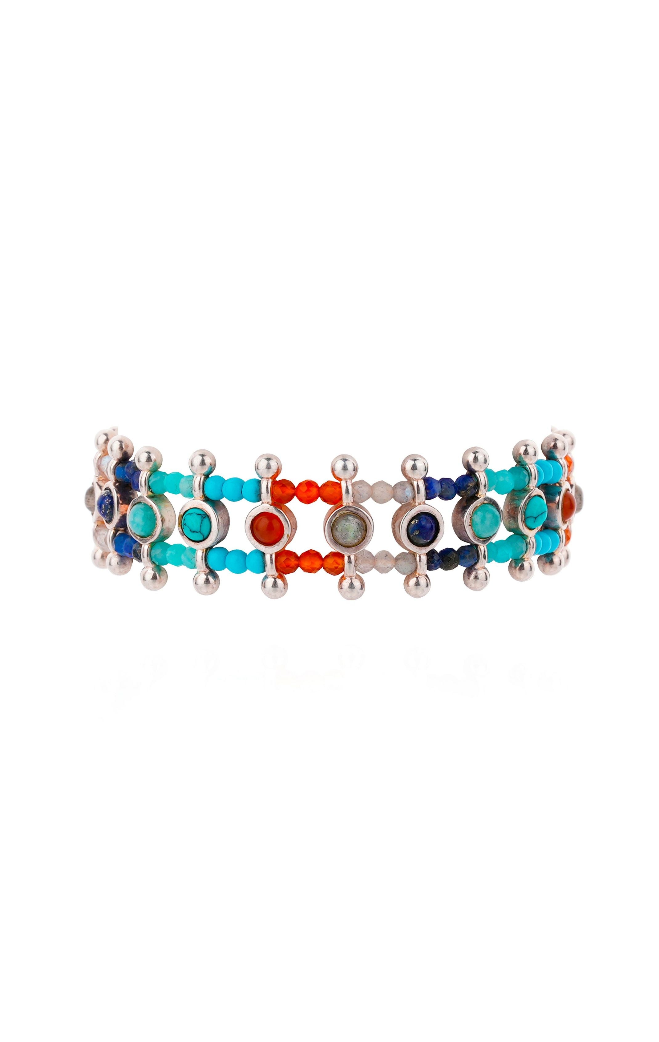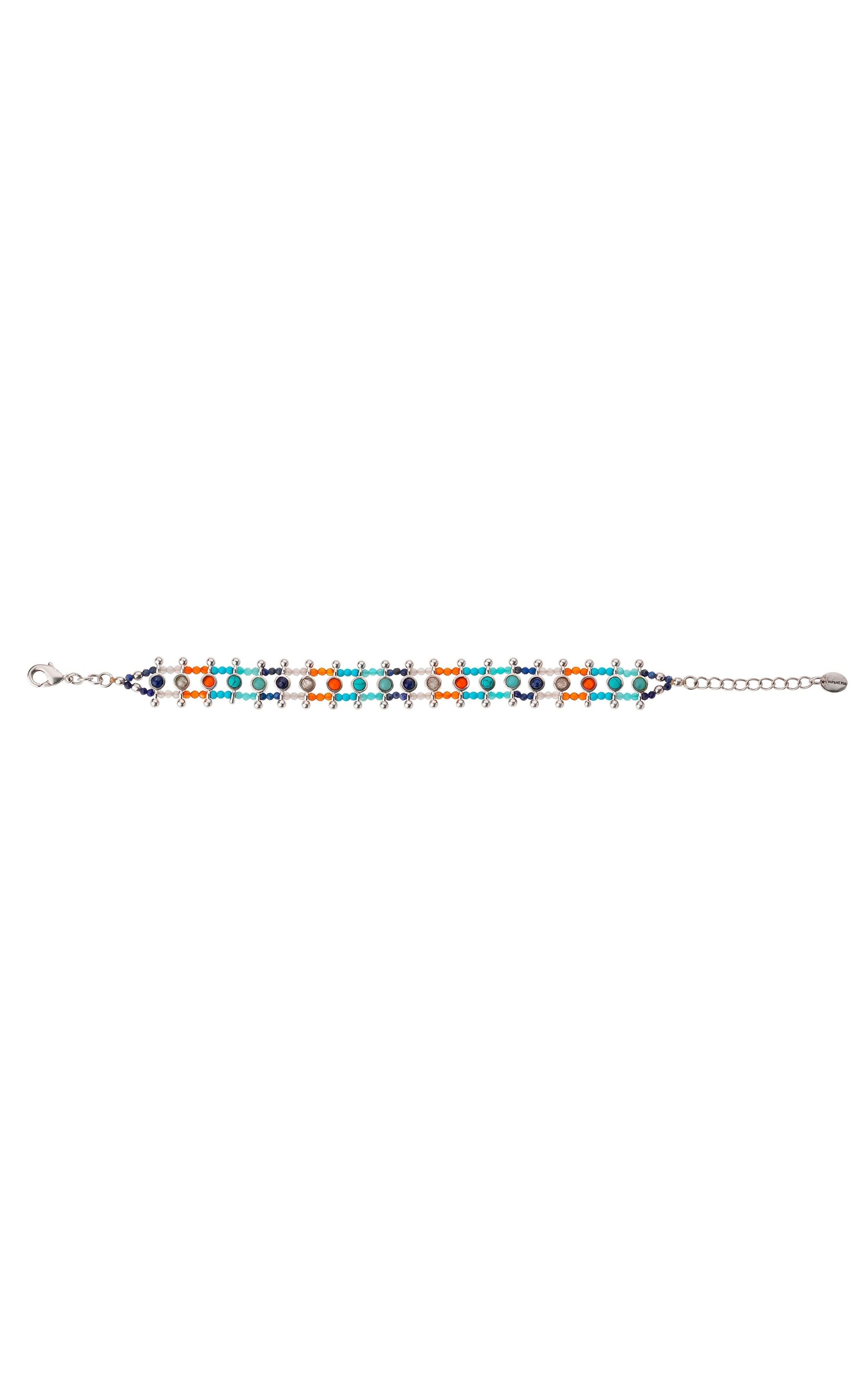 This lovely bracelet pays tribute to the remarkable heritage of Native American art and its Navajo inspiration, a theme dear to Hipanema since its creation. Rhythmed with panache by semi-precious stones (Lapis, Turqoise, Labradorite, Amazonite, Garnet Orange and Red Agate) framed by two silver links, it sublimates your wrist and enhances your allure with powerful harmony.