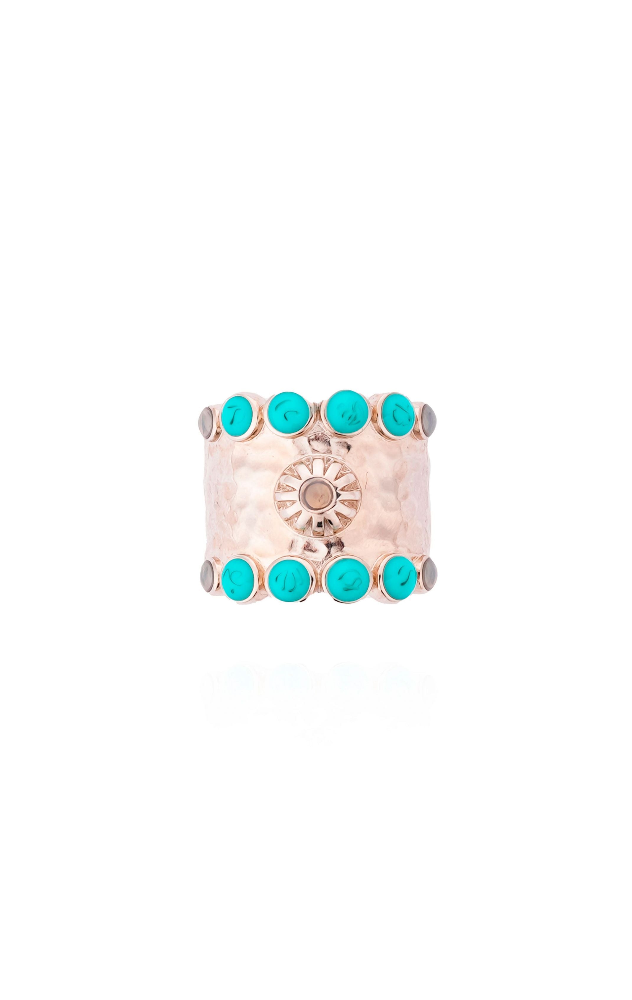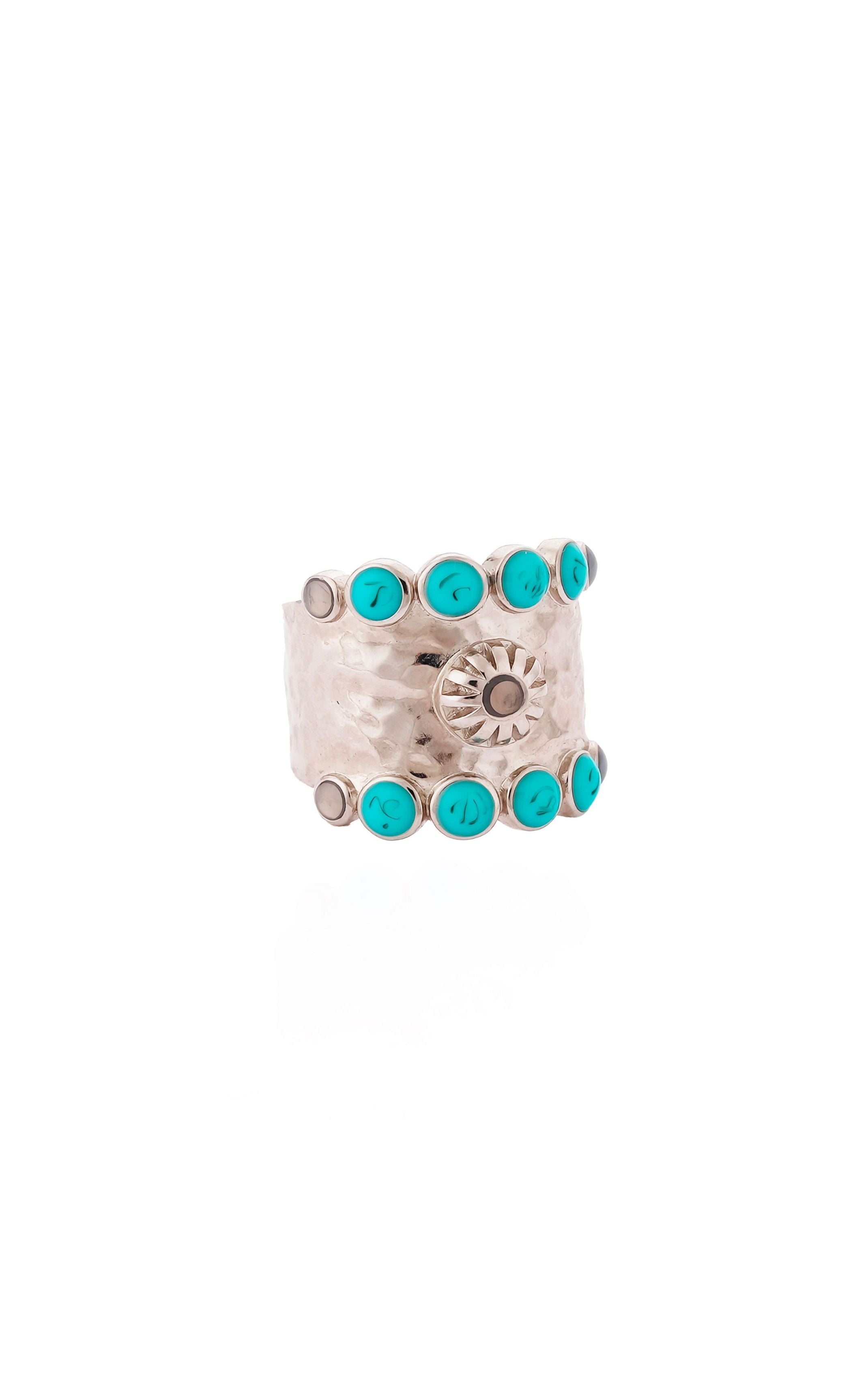 A majestic incarnation of our theme, this silver ring takes us to the plains of North America to discover the breathtaking aesthetics of the Sioux, Iroquois and Cheyenne cultures. At the center is a clear topaz cabochon encircled by finely worked striations. This entirely hand-crafted jewel features a hammered ring body highlighted by two rows of enameled turquoise stones. Adjustable, Fernando fits all sizes and will accessorize your hand with ostentatious elegance.