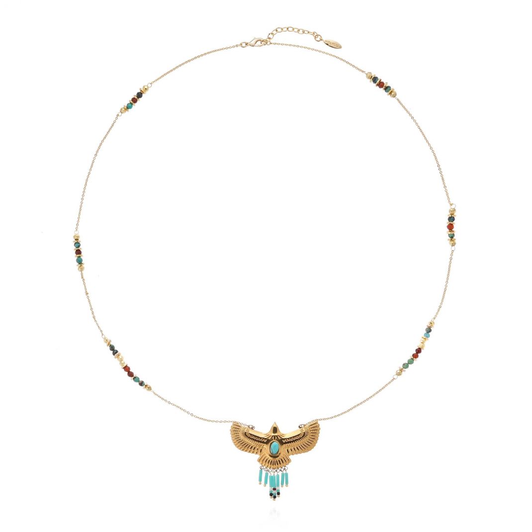 Worn proudly like a precious breastplate, the WINGS necklace, in copper gilded with 14-carat fine gold, is mounted on a delicate forçat chain, punctuated with turquoise and garnet beads, like a rosary chain. At its center is the grandiose eagle that soars over this collection, entirely hand-worked and adorned with an oval turquoise cabochon.