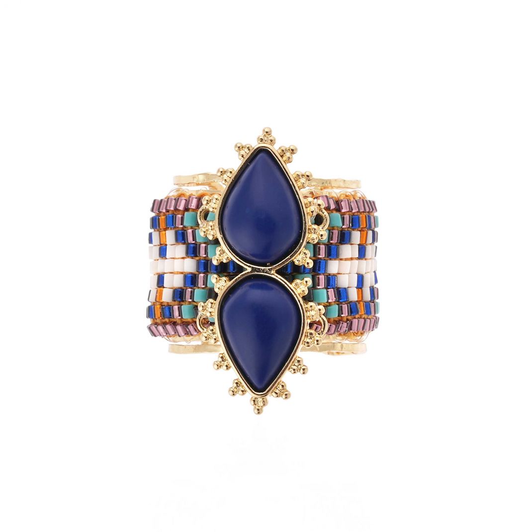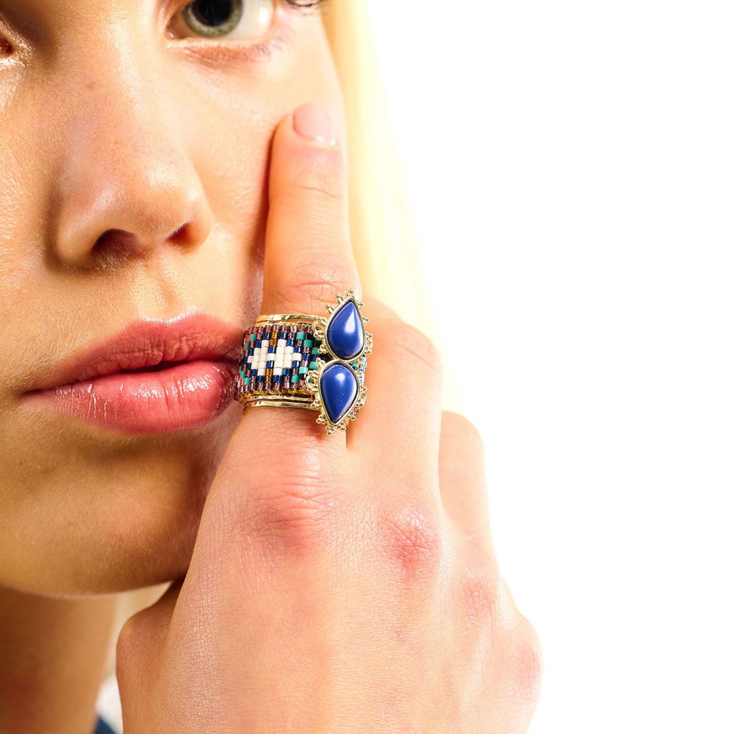 In homage to the Navajo aesthetic, which HIPANEMA constantly reinterprets with each new collection, the VIVA ring takes shape in a ring body entirely hand-hammered in 14-carat fine gold-plated brass, available in four colors. In its indigo version, the VIVA ring is adorned with klein blue, petroleum blue, bronze and white seed beads, with motifs inspired by the Navajo world so dear to us. In the center, a cabochon of two symmetrical indigo drops, set in a ball setting, adds a touch of elegance.
