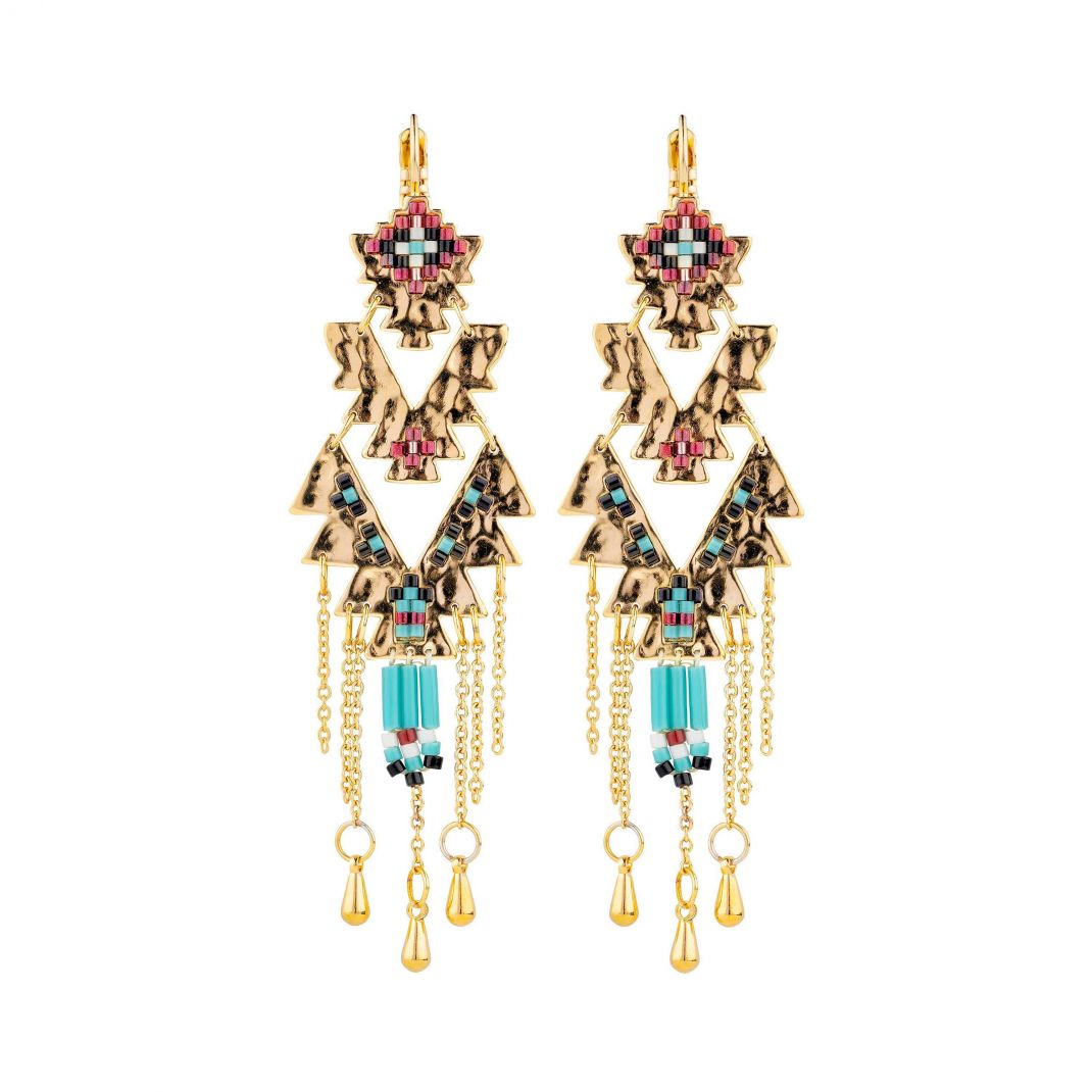 NUNES is a 14-carat gold-plated earring mounted on a delicate sleeper and distinguished by its large, symmetrical structure. Evoking a Mayan inspiration, the print it features is reworked with woven beads and pretty gold chains. Its shades of black, amber and turquoise confirm its iconic and exquisite character.NUNES is a 14-carat fine gold earring, mounted on a delicate sleeper and distinguished by its large symmetrical structure. Evoking a Mayan inspiration, the print it bears is reworked with woven beads and pretty gold chains. Shades of black, amber and turquoise confirm its iconic and exquisite character.