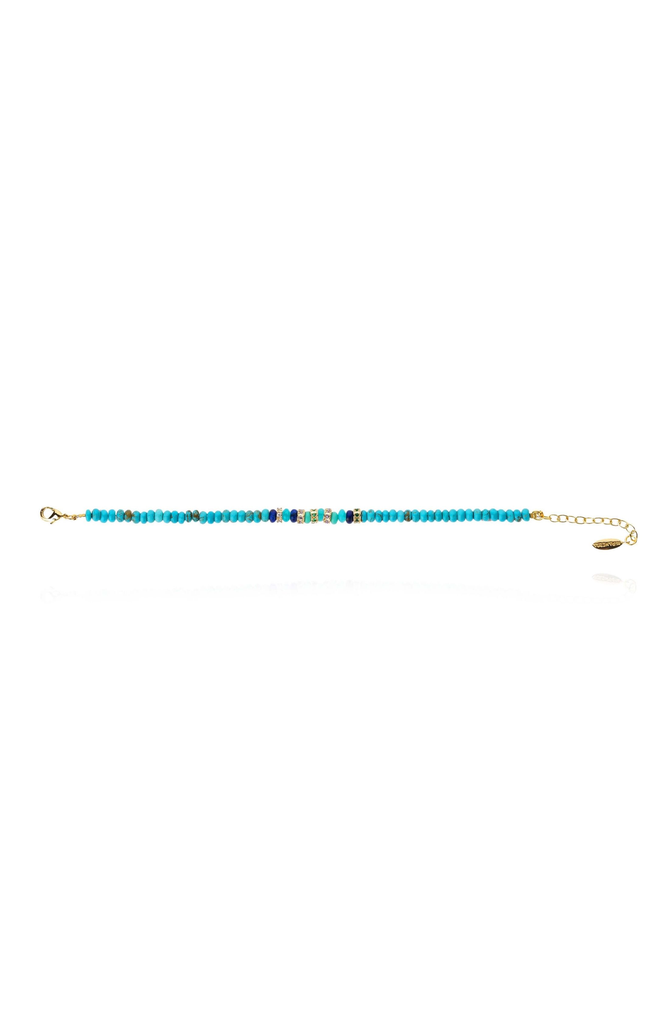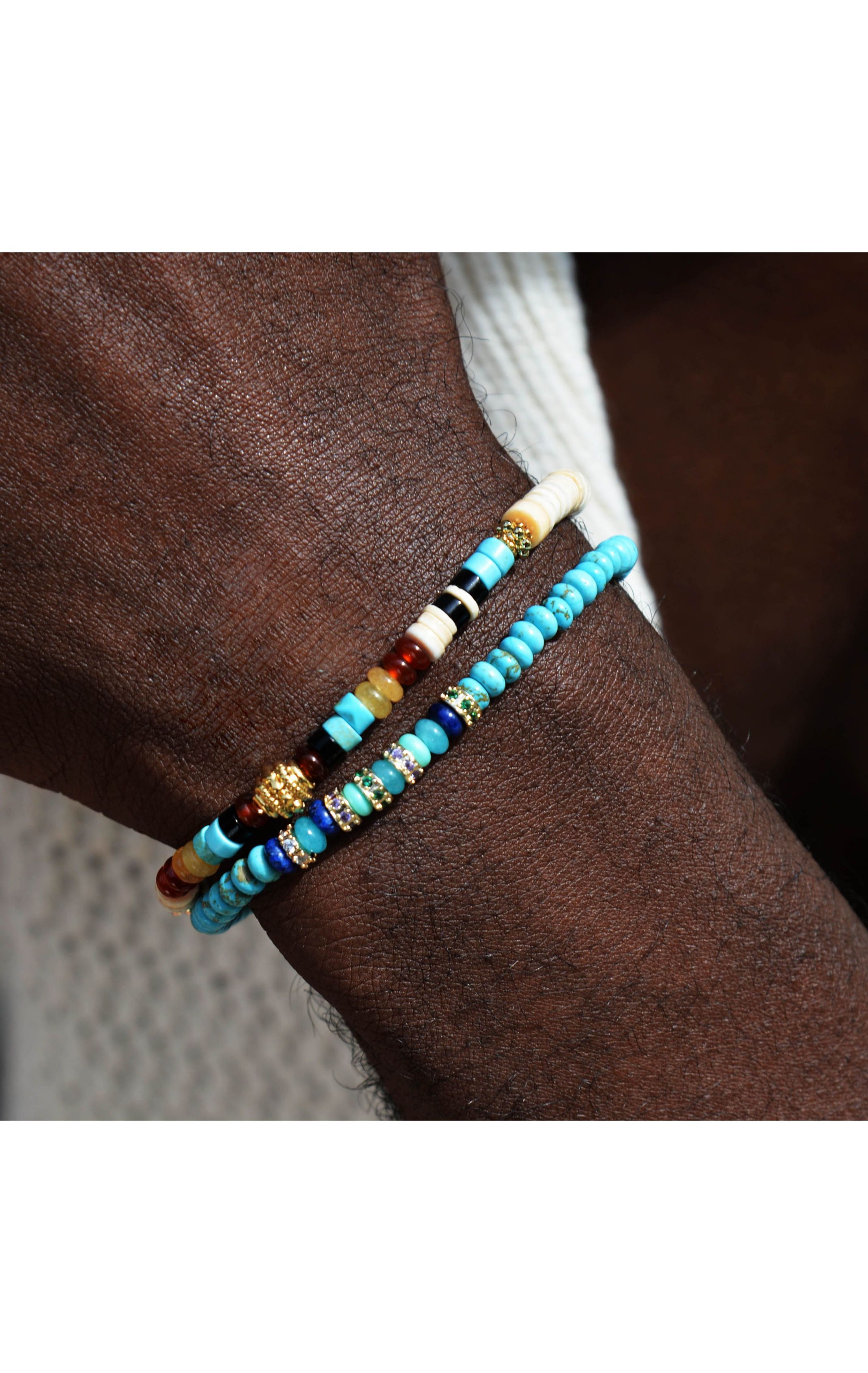 The Bangalor turquoise bracelet plays the block color card, with a dominant turquoise color carried by regular rondelles of recomposed turquoise, punctuated by fine gold rondelles. Available in eight different shades, dare to elegantly accumulate all the variations of our Bangalor bracelet for a colorful summer!