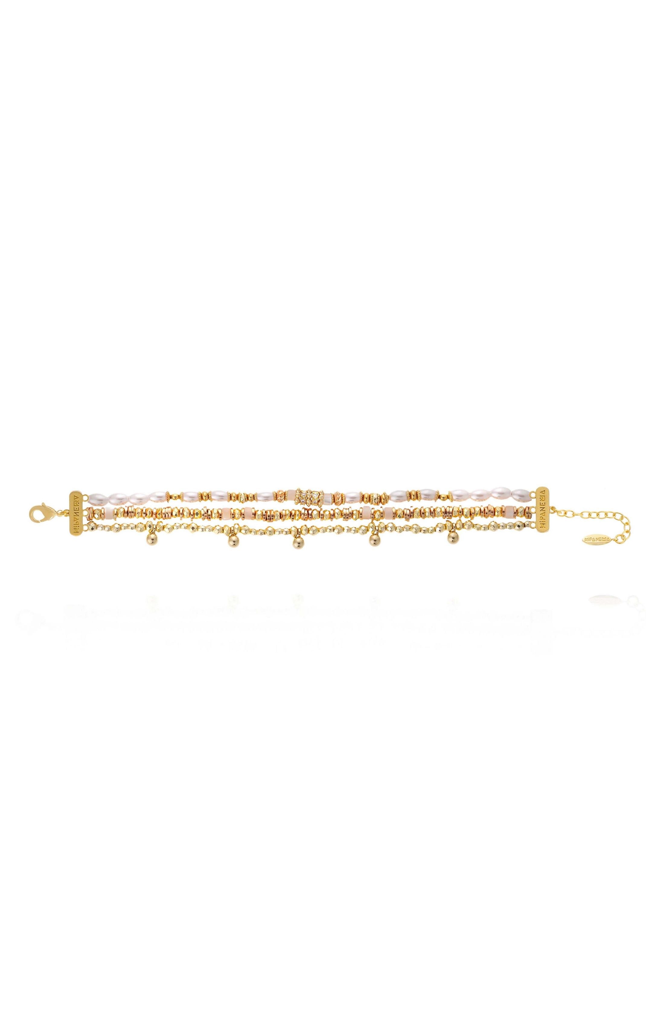 Our gold Vadorada bracelet is a magnificent piece, gilded with fine gold, composed of three rows of pearly white shell pearls, enhanced with gold rondelles and flat pearls. For perfect harmony, it can be paired with the Trion necklace, or mixed with one or more of the seven other color variations available.