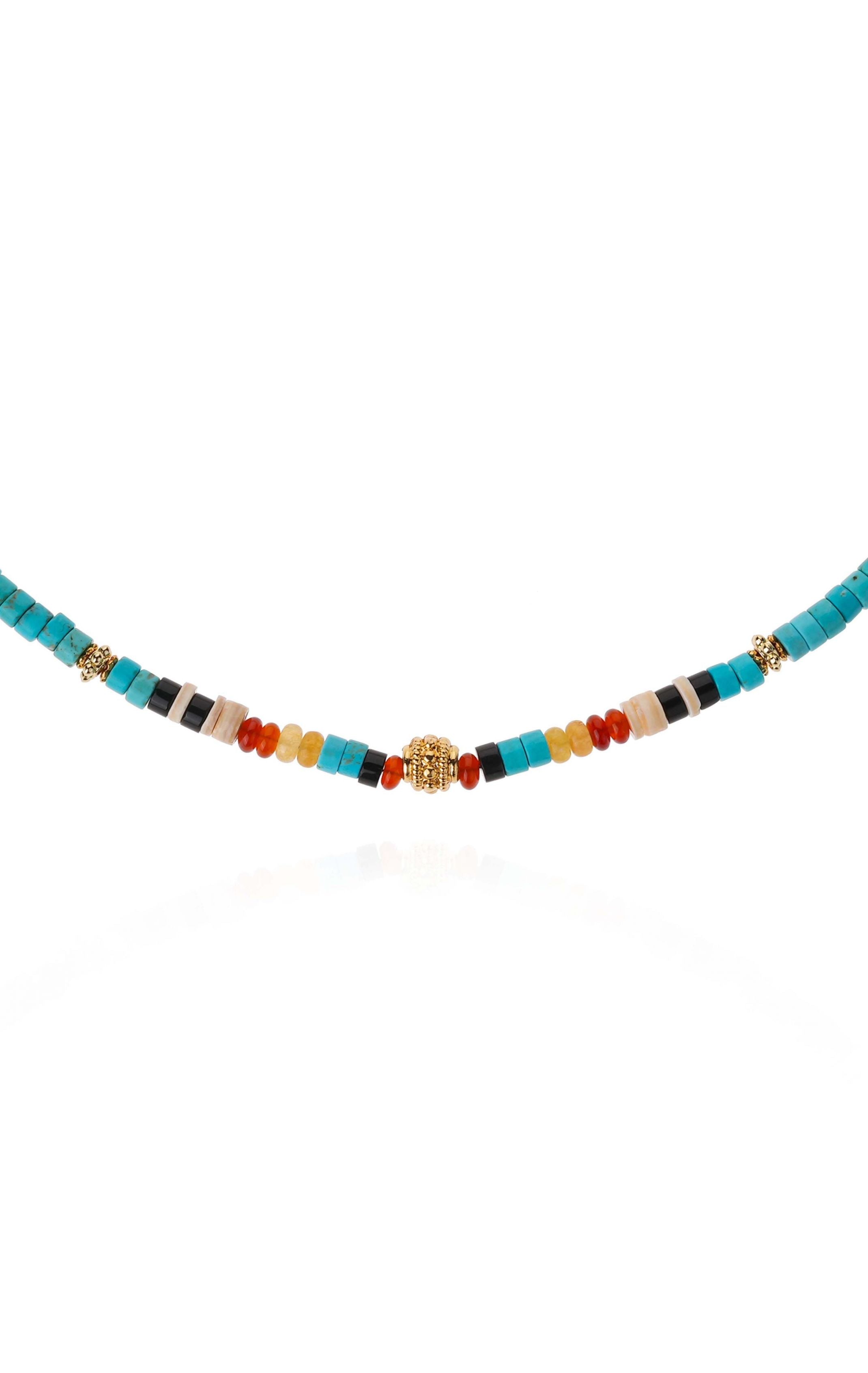 The cream-colored Jaipur necklace alternates sequences of tinted agate, shell, lapis and garnet beads on either side of a meticulously hand-worked gold rondelle pendant.