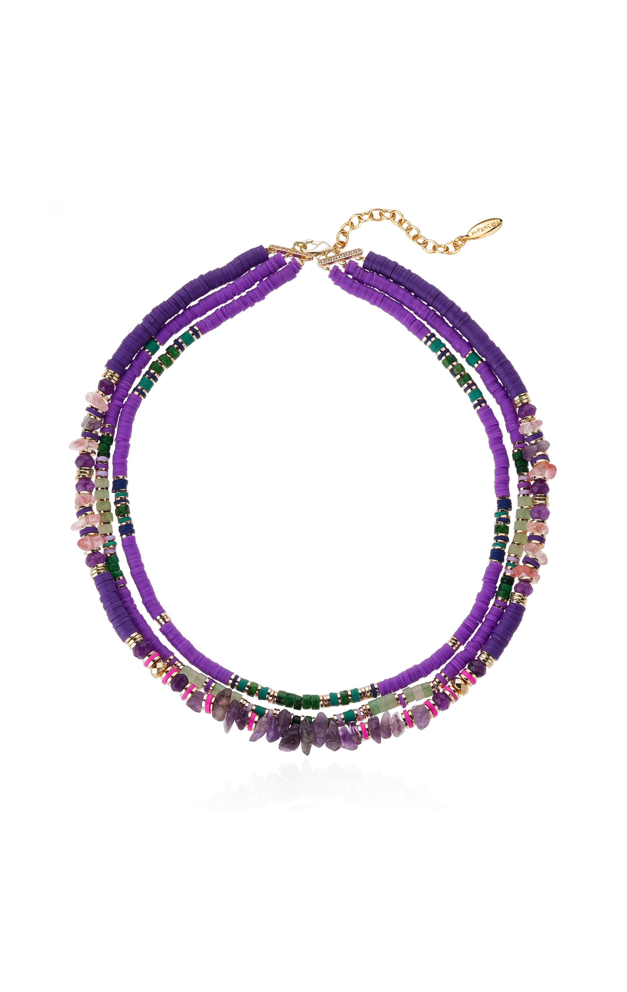 Our Trion violet necklace is a magnificent gold-plated necklace featuring three links of delicately irregular stones and flat beads in tinted agate and recomposed turquoise, enhanced with bright violet, lilac, turquoise and pink silicone rondelles and fine gold-plated rondelles. Match it with the Vadorada bracelet for a harmonious glow, or mix it with one or more of its seven other color variations.